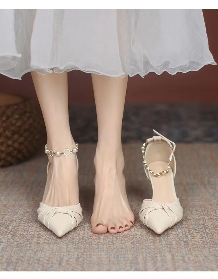 블랙 하이힐 여성 2024 년 여름 뉴 포인티드 펄 싱글 슈즈 들러리 스틸레토 힐 할로우 샌들