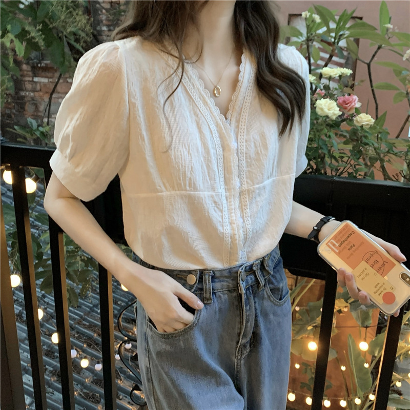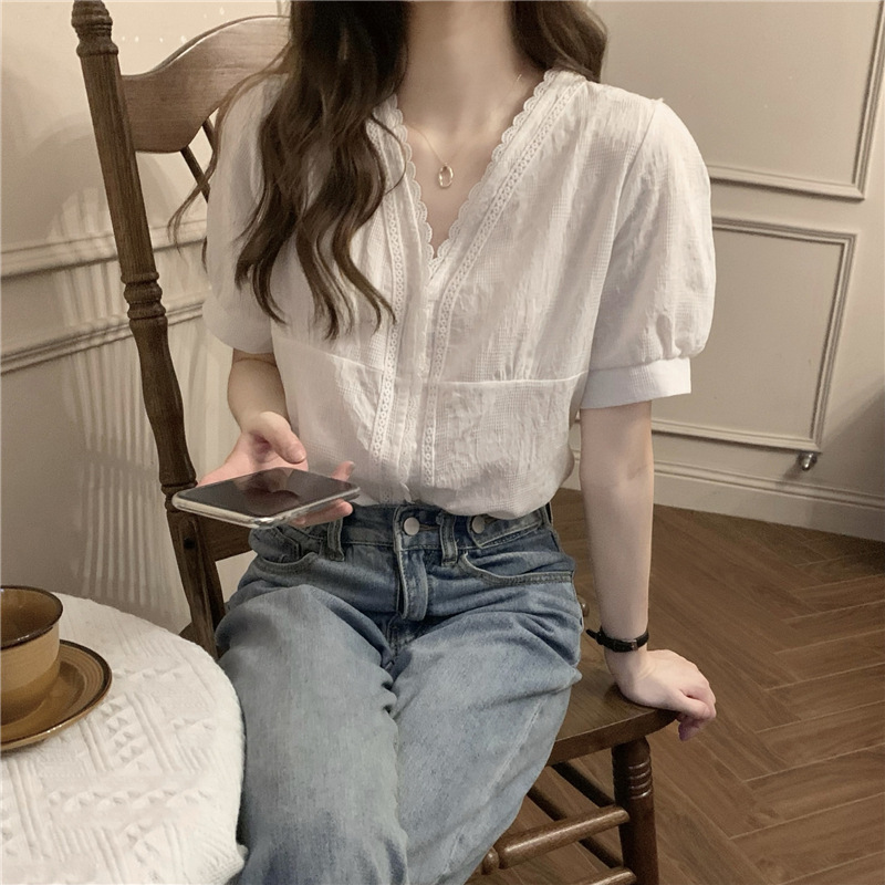 한국 스타일 슬림 v 넥 레이스 퍼프 슬리브 셔츠 여성 2025 여름 프랑스 복고풍 디자인 화이트 셔츠스토어 가기