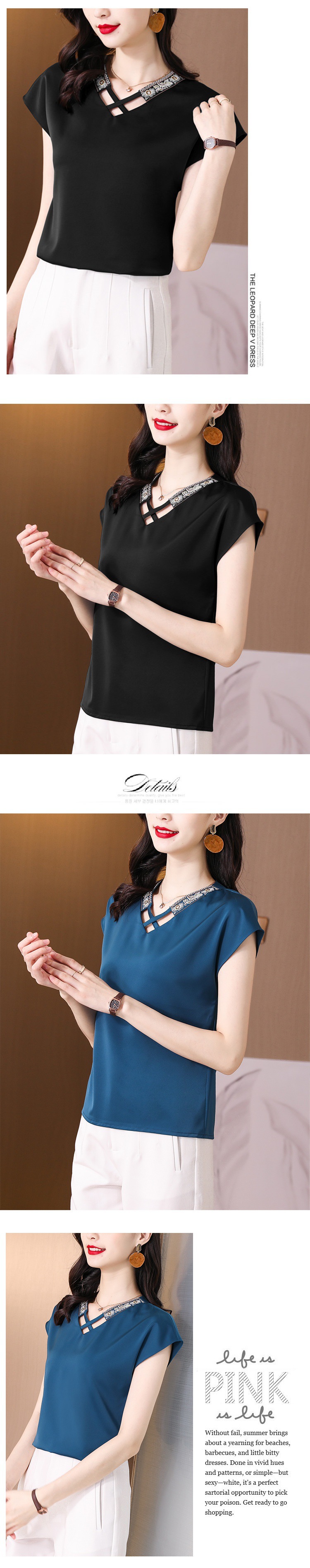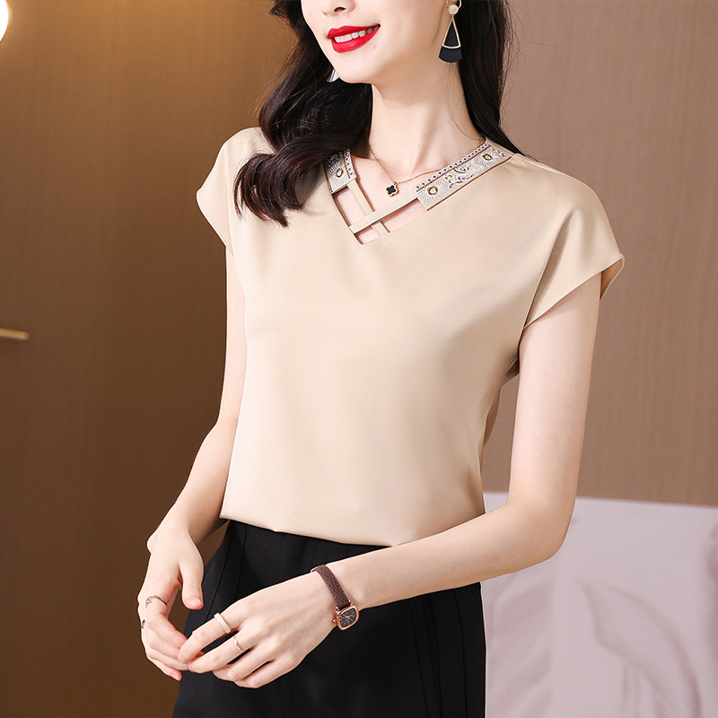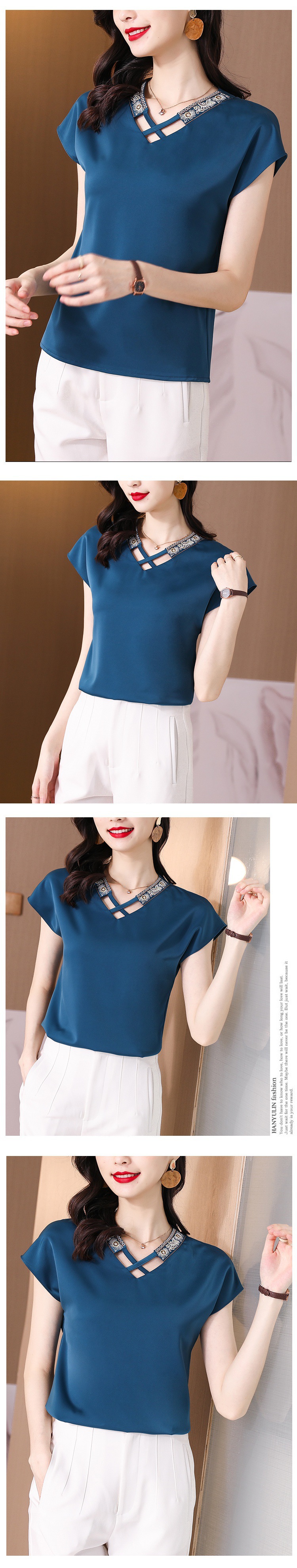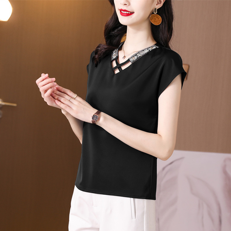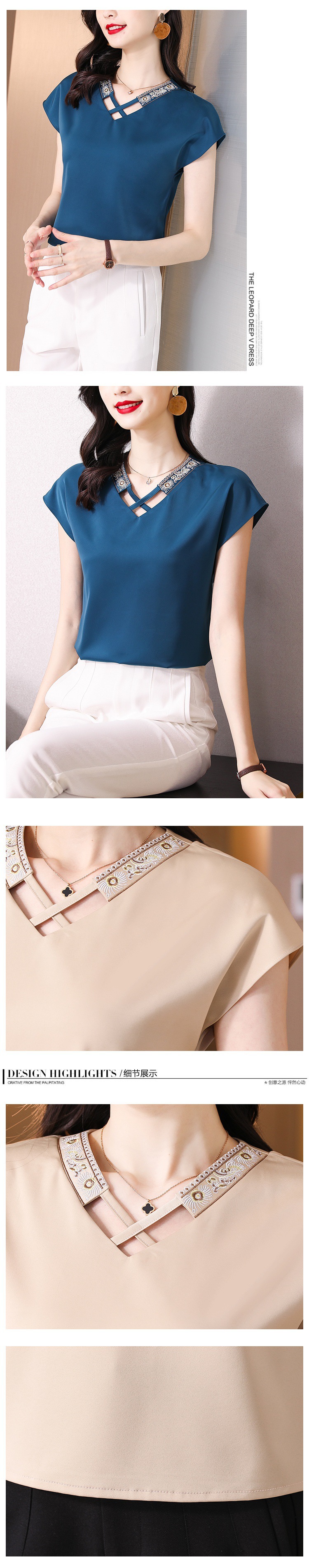 리얼 샷 새틴 반팔 티셔츠 여자 2024 년 여름 새 수놓은 쉬폰 셔츠 V-넥 자수 최고 여성 작은 셔츠스토어 가기