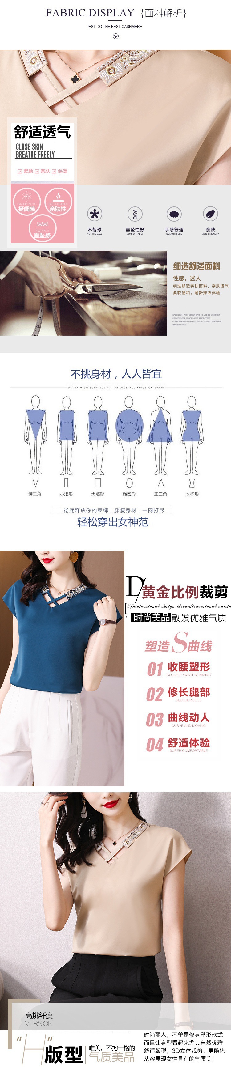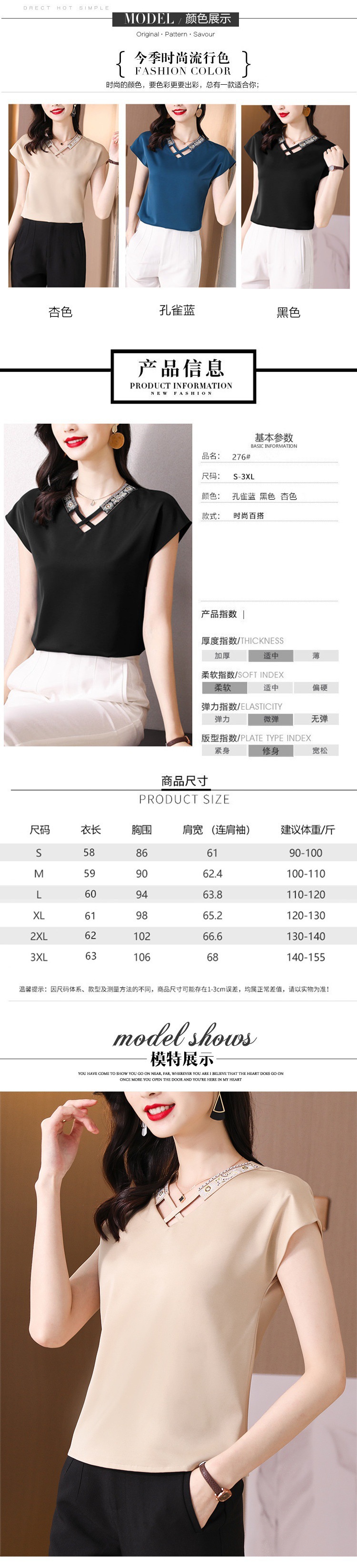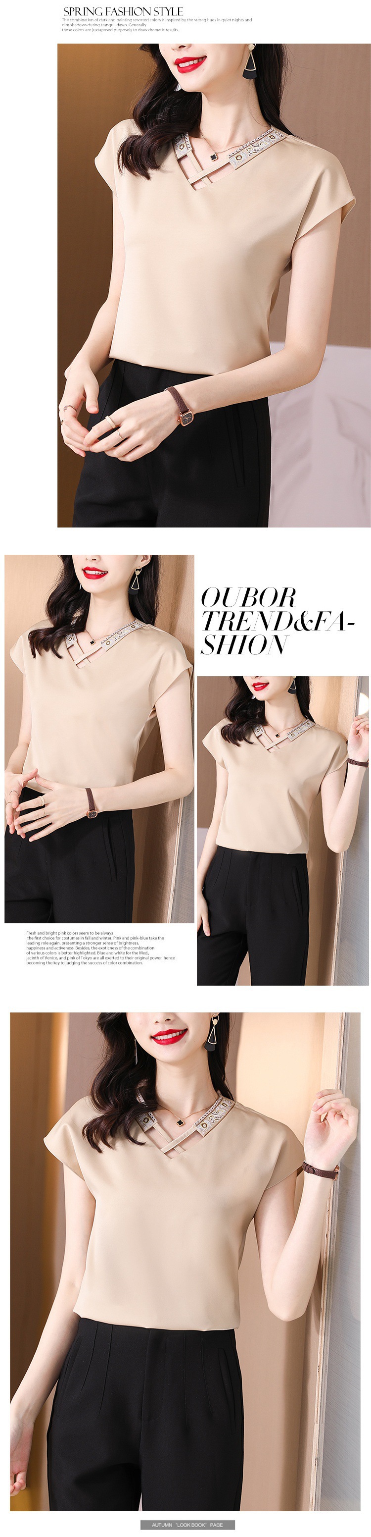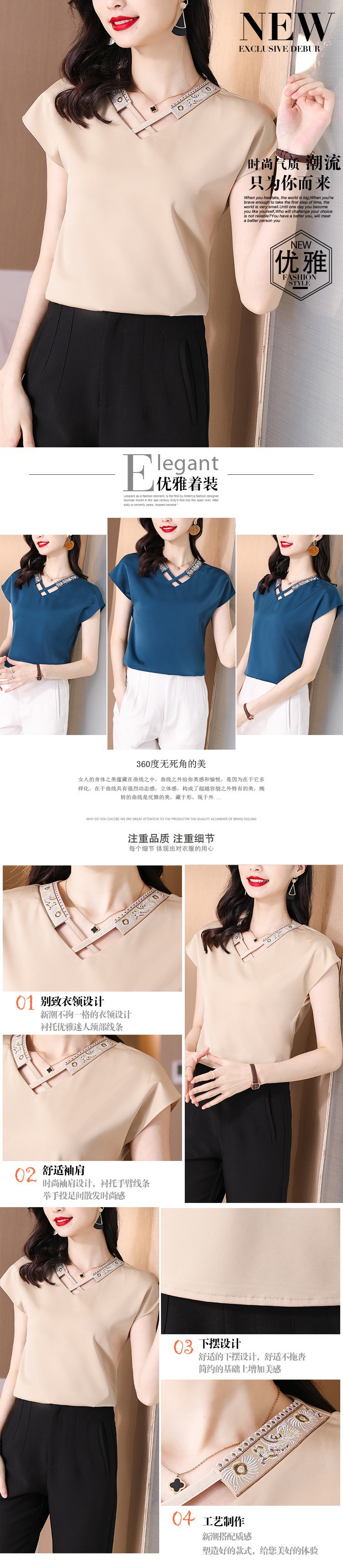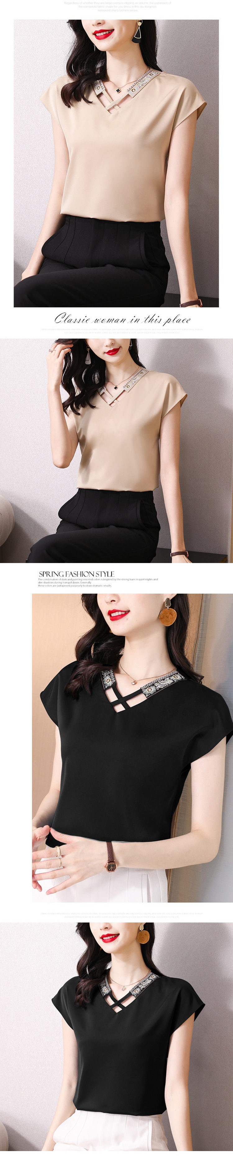 리얼 샷 새틴 반팔 티셔츠 여자 2024 년 여름 새 수놓은 쉬폰 셔츠 V-넥 자수 최고 여성 작은 셔츠스토어 가기
