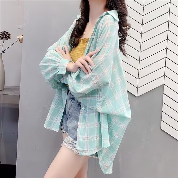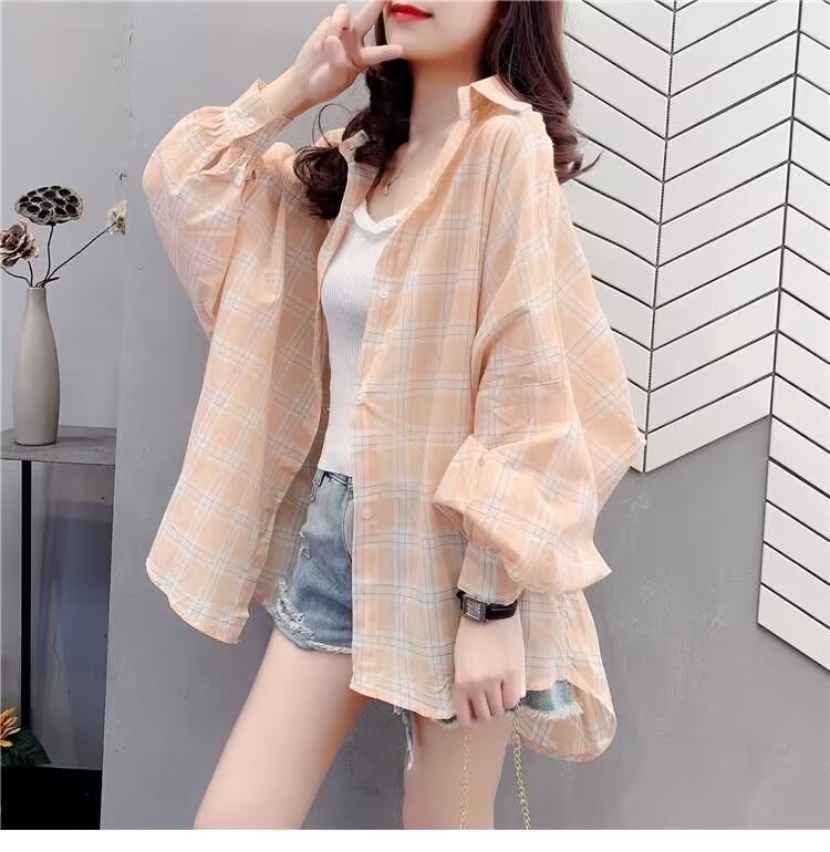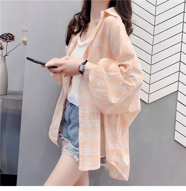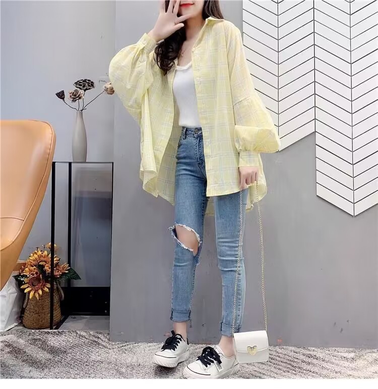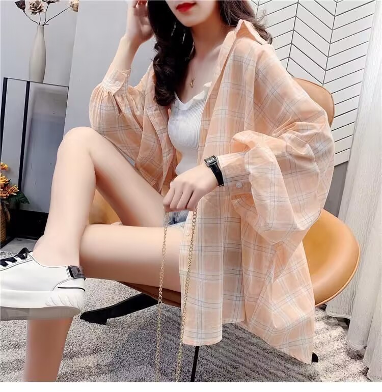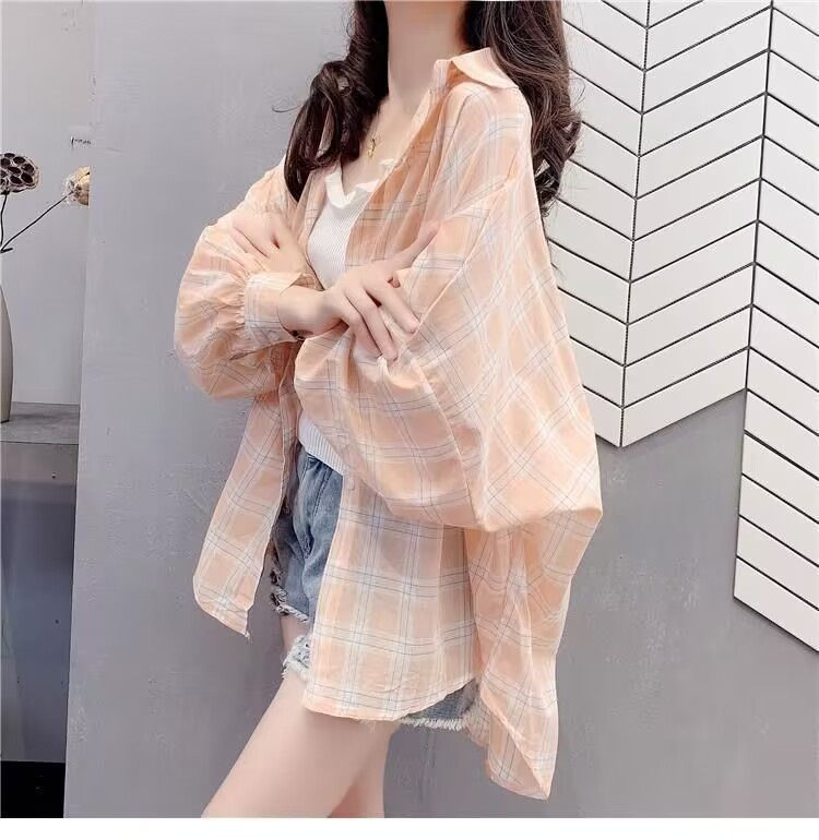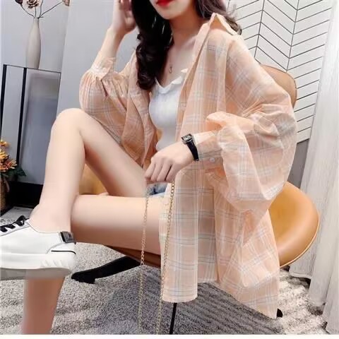 동대문 여름 새 쉬폰 선 스크린 격자 셔츠 여성용 긴 소매 한국 느슨한 중간 길이 얇은 코트 탑스토어 가기