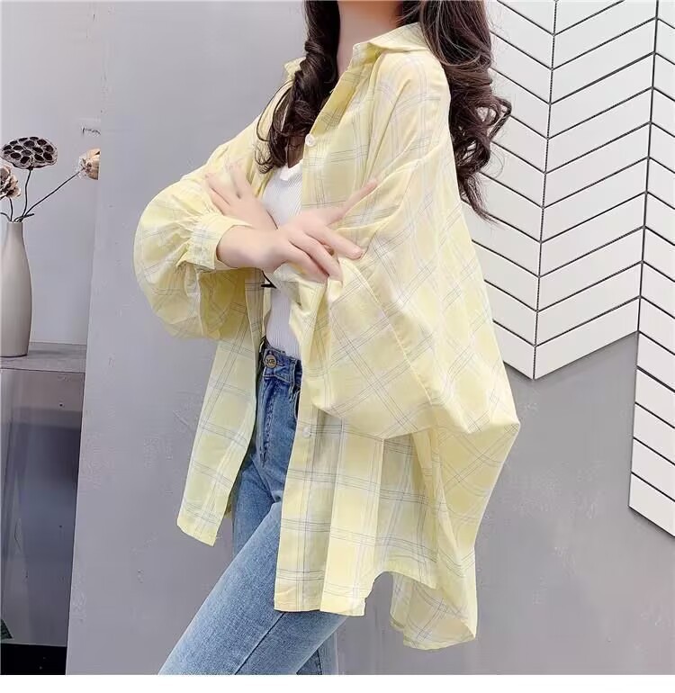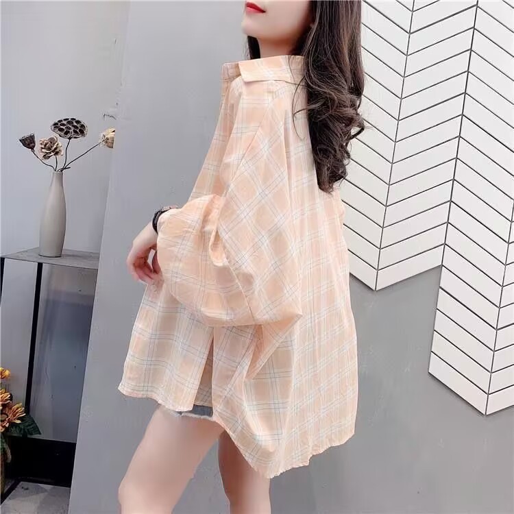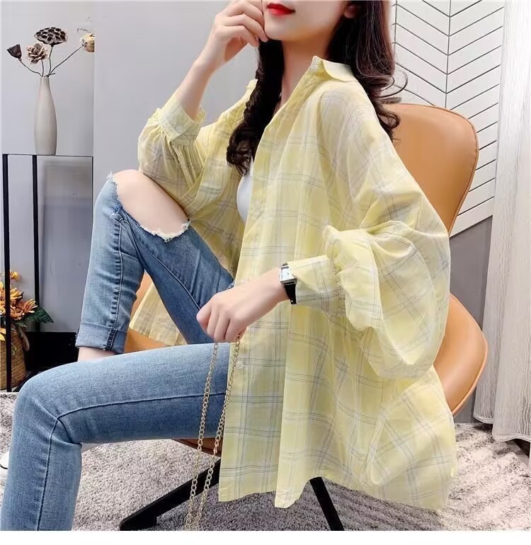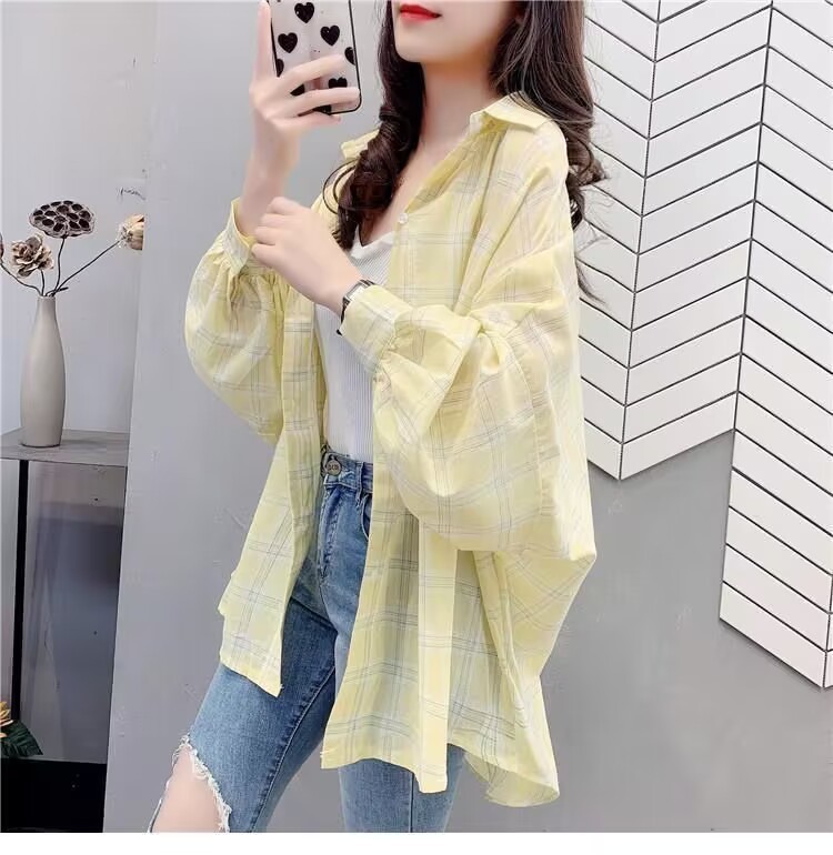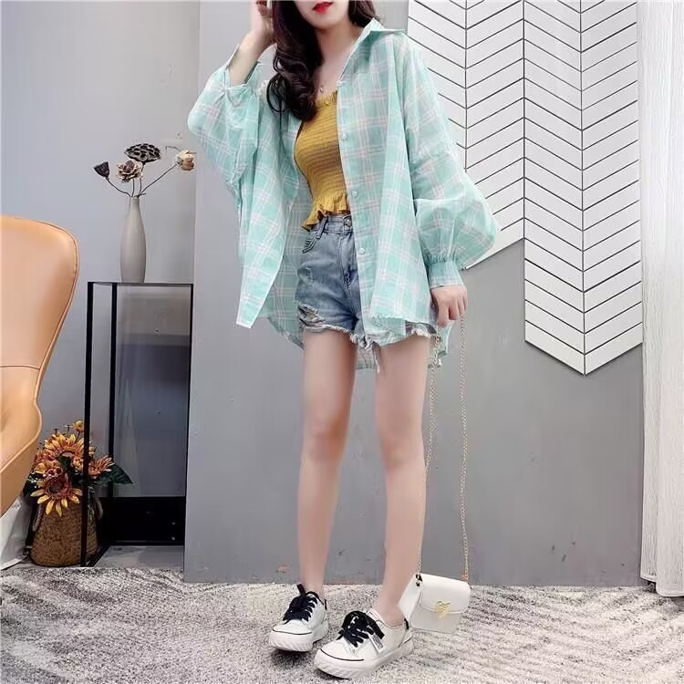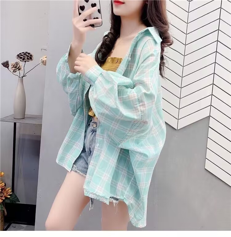 동대문 여름 새 쉬폰 선 스크린 격자 셔츠 여성용 긴 소매 한국 느슨한 중간 길이 얇은 코트 탑스토어 가기