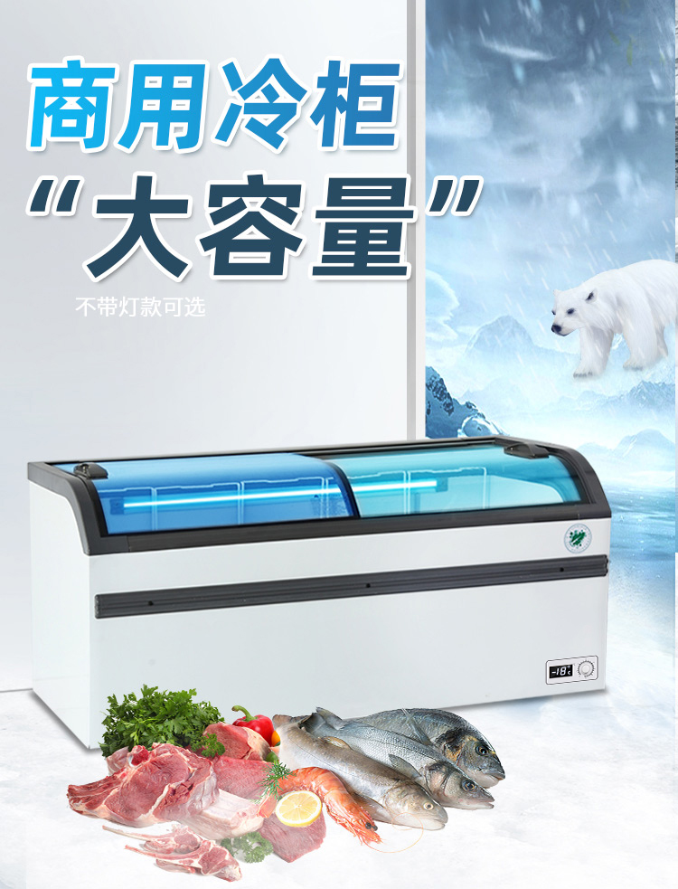 수평 냉장 상업용 대용량 아크 투명 유리 아이스크림 캐비닛 슈퍼마켓 조합 냉동 디스플레이 캐비닛 섬 캐비닛스토어 가기