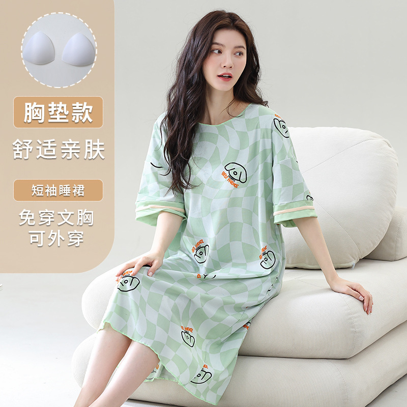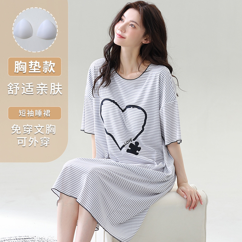 가슴 패드와 여성 원피스 잠옷 여름 모달면 반팔 얇은 아이스 실크 스레드 파자마 안티 범프 홈 원피스