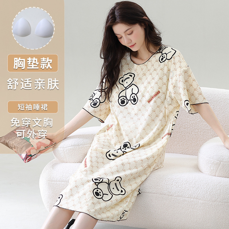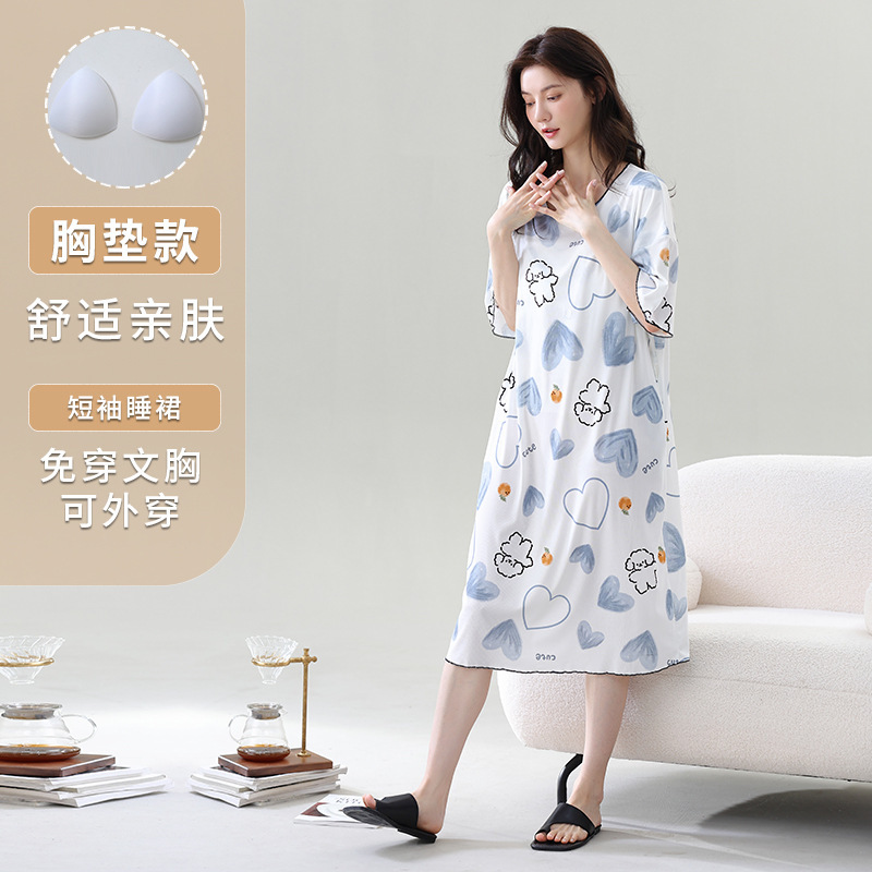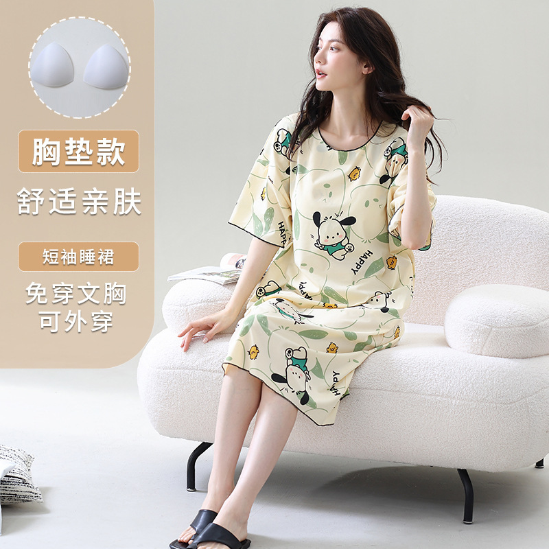 가슴 패드와 여성 원피스 잠옷 여름 모달면 반팔 얇은 아이스 실크 스레드 파자마 안티 범프 홈 원피스스토어 가기