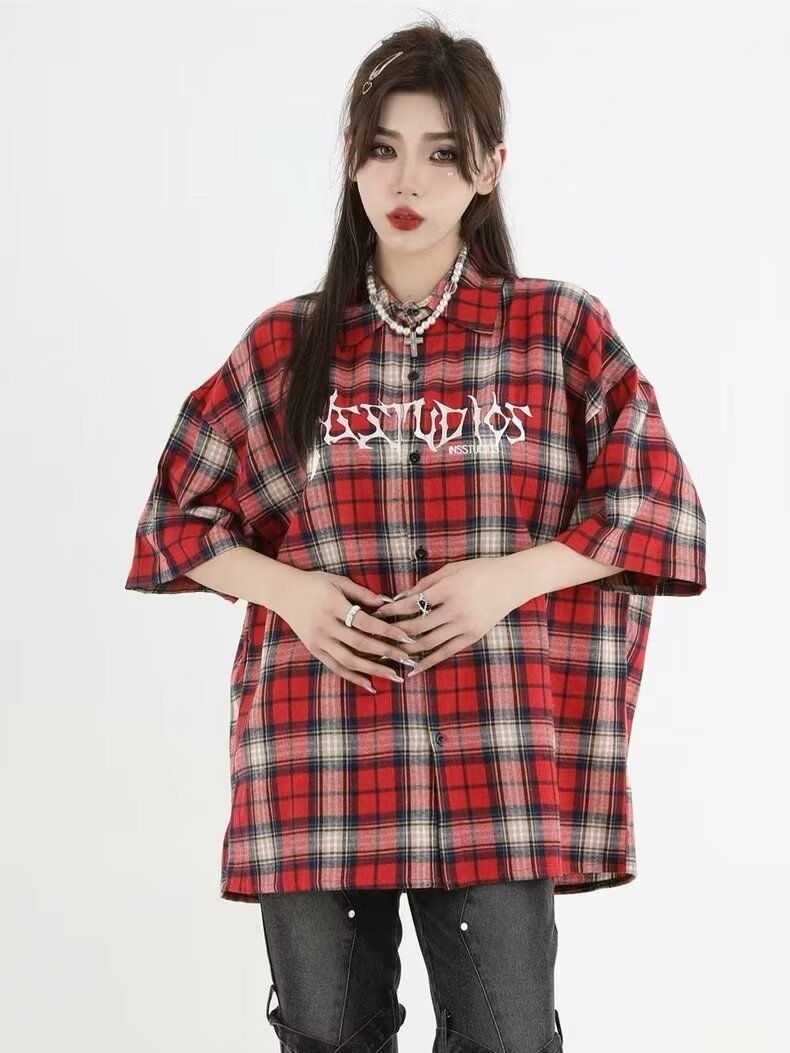 미국 빈티지 편지 자수 격자 무늬 셔츠 짧은 소매 남성과 여성의 여름 하이 스트리트 오버 사이즈 캐주얼 셔츠 재킷