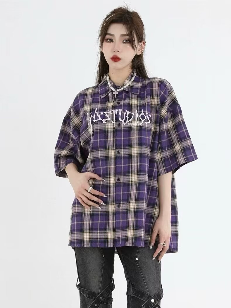 미국 빈티지 편지 자수 격자 무늬 셔츠 짧은 소매 남성과 여성의 여름 하이 스트리트 오버 사이즈 캐주얼 셔츠 재킷스토어 가기