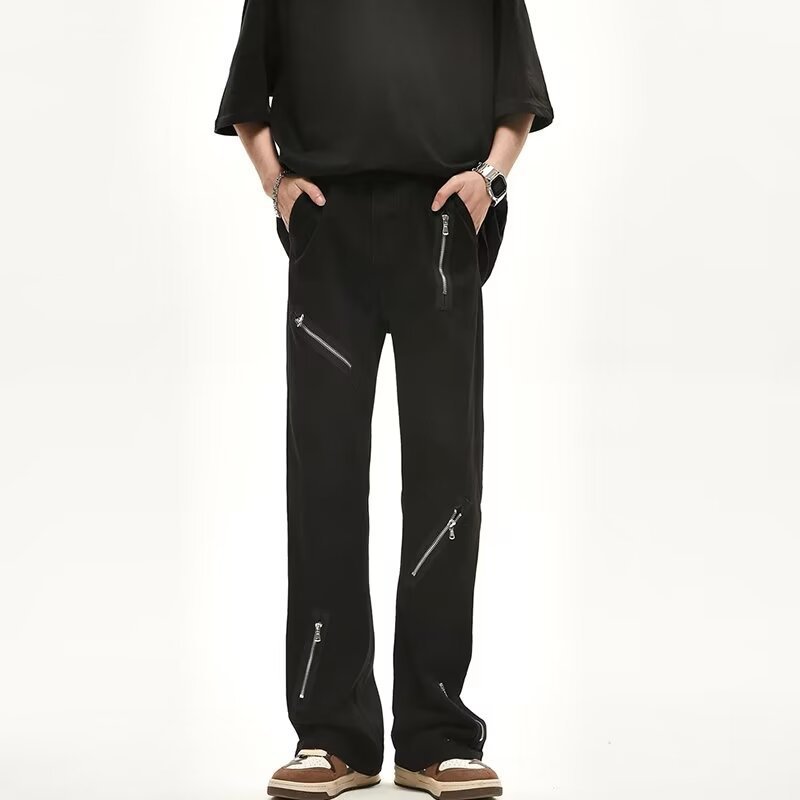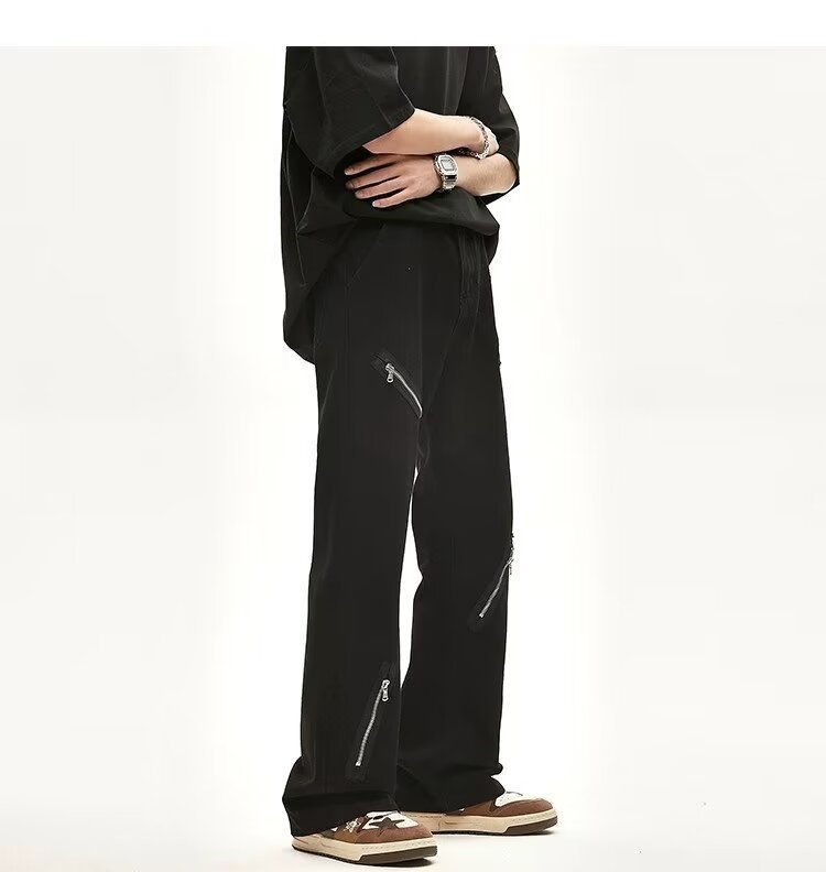 새로운 미국 스타일 하이 스트리트 지퍼 디자인 센스 블랙 청바지 트렌디 남성용 트렌디 브랜드 루즈 레트로 스트레이트 마이크로 팬츠