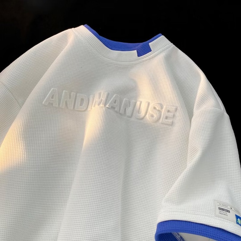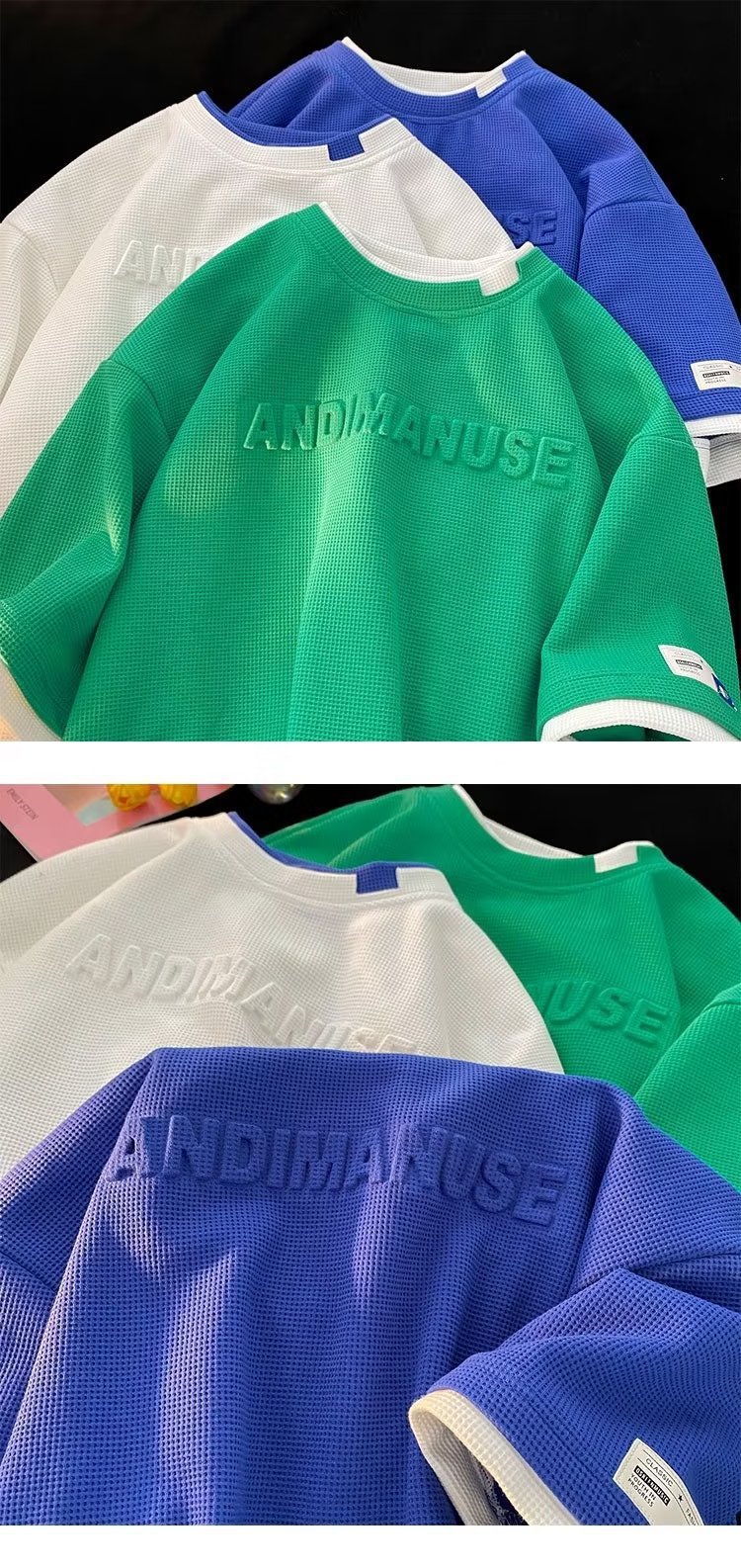 가짜 투피스 와플 반팔 티셔츠 남성용 홍콩 스타일 반소매 여름 루즈 오버 사이즈 디자인 틈새 탑