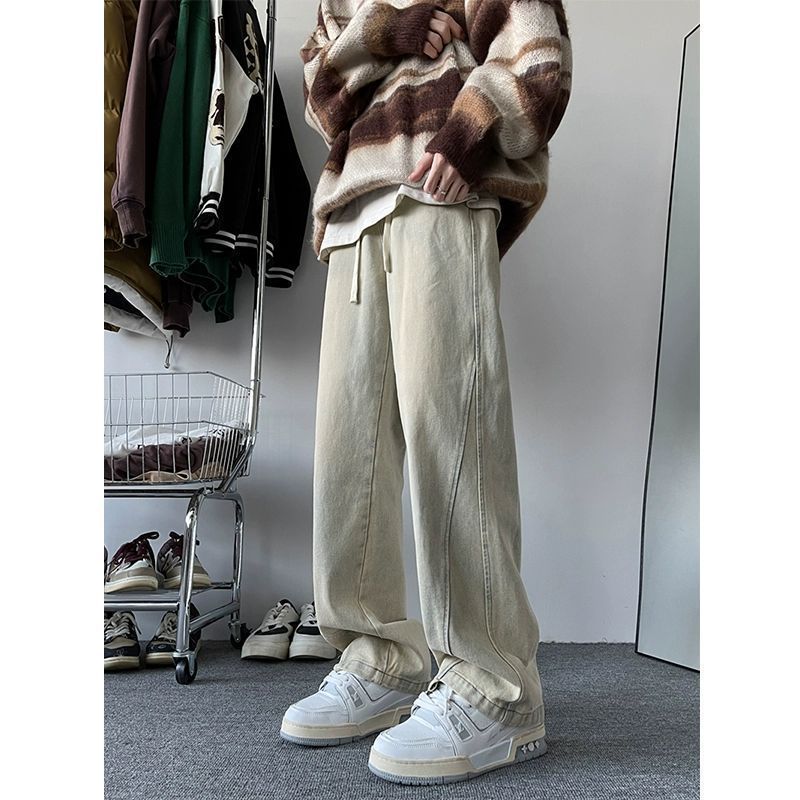옐로우 머드 아메리칸 스타일 레트로 청바지 남성용 봄과 가을 뉴 스타일 리퍼 핸섬 스트레이트 캐주얼 트렌디 브랜드 드로스트링 마이크로 바지스토어 가기