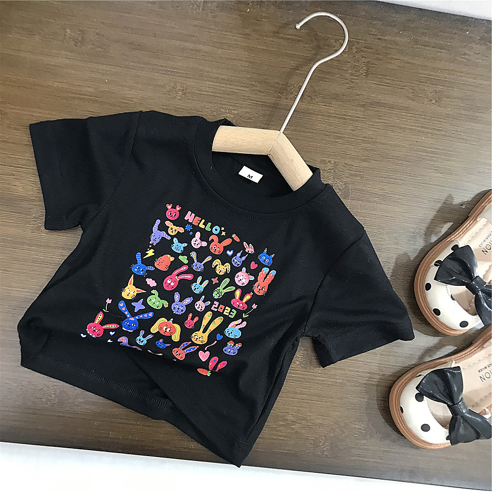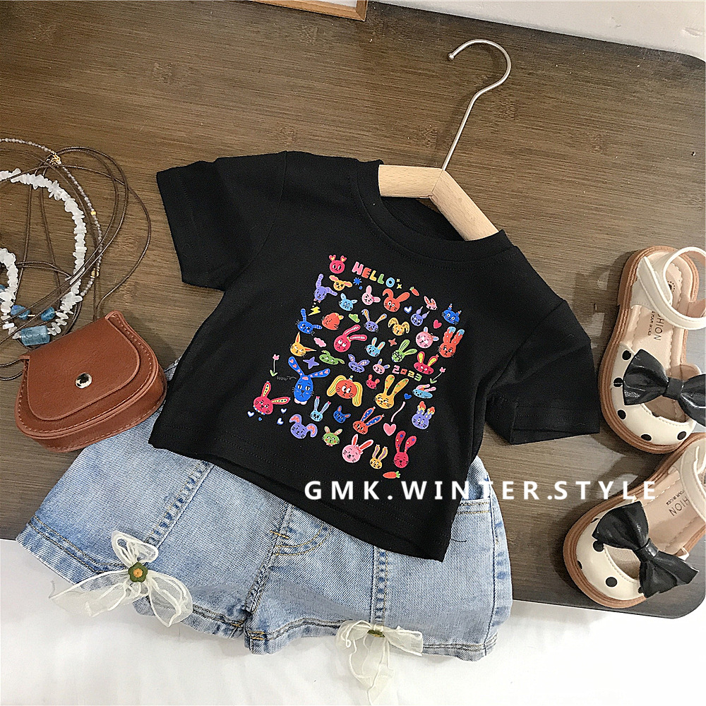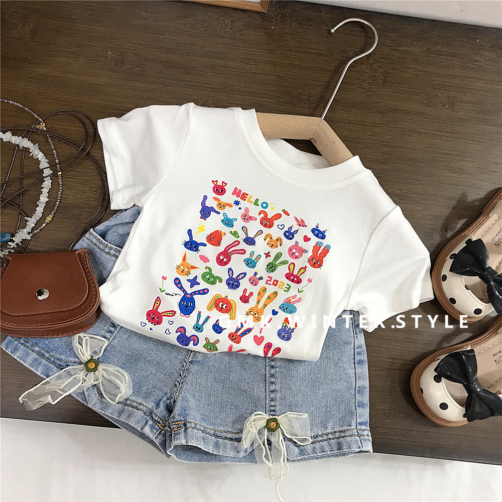 여자 여름 새 티셔츠 아기 얇은 반 소매 소녀 여름 짧은 소매 최고 소녀 데님 반바지 대외 무역스토어 가기