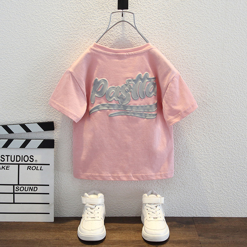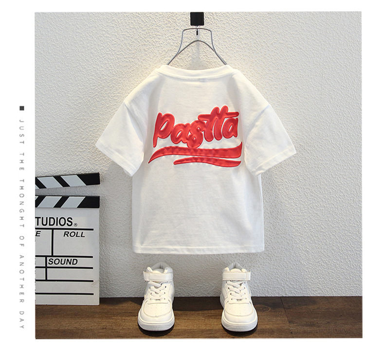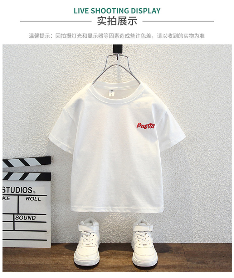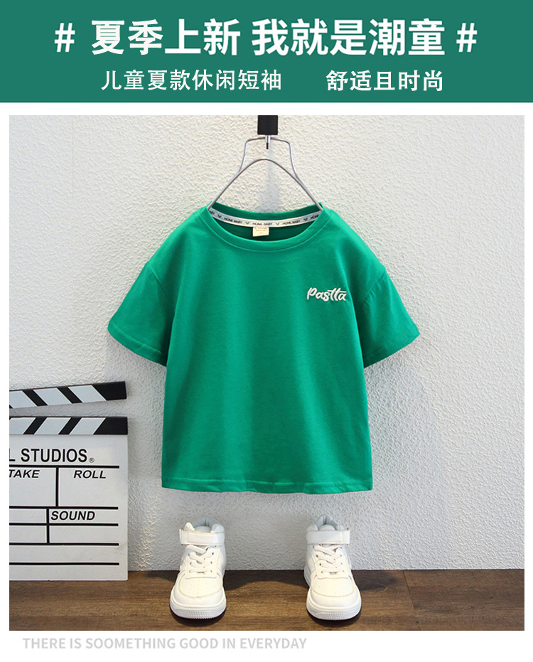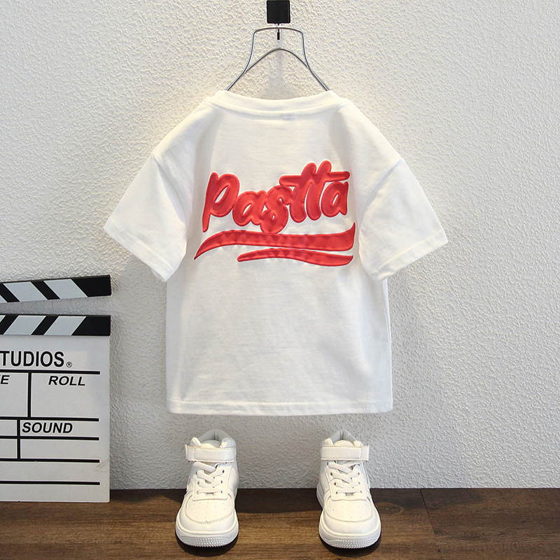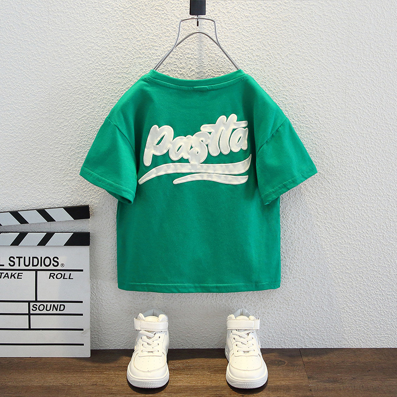 남자들의 여름 반팔 티셔츠 2024 중소 어린이 트렌디 한 외국식 라운드 넥 탑을위한 새로운 어린이 여름 원피스