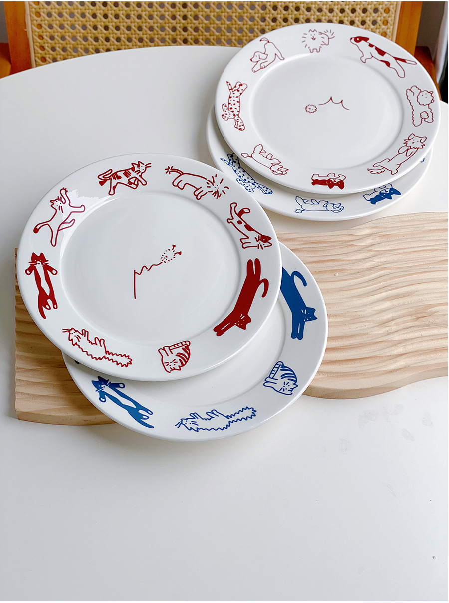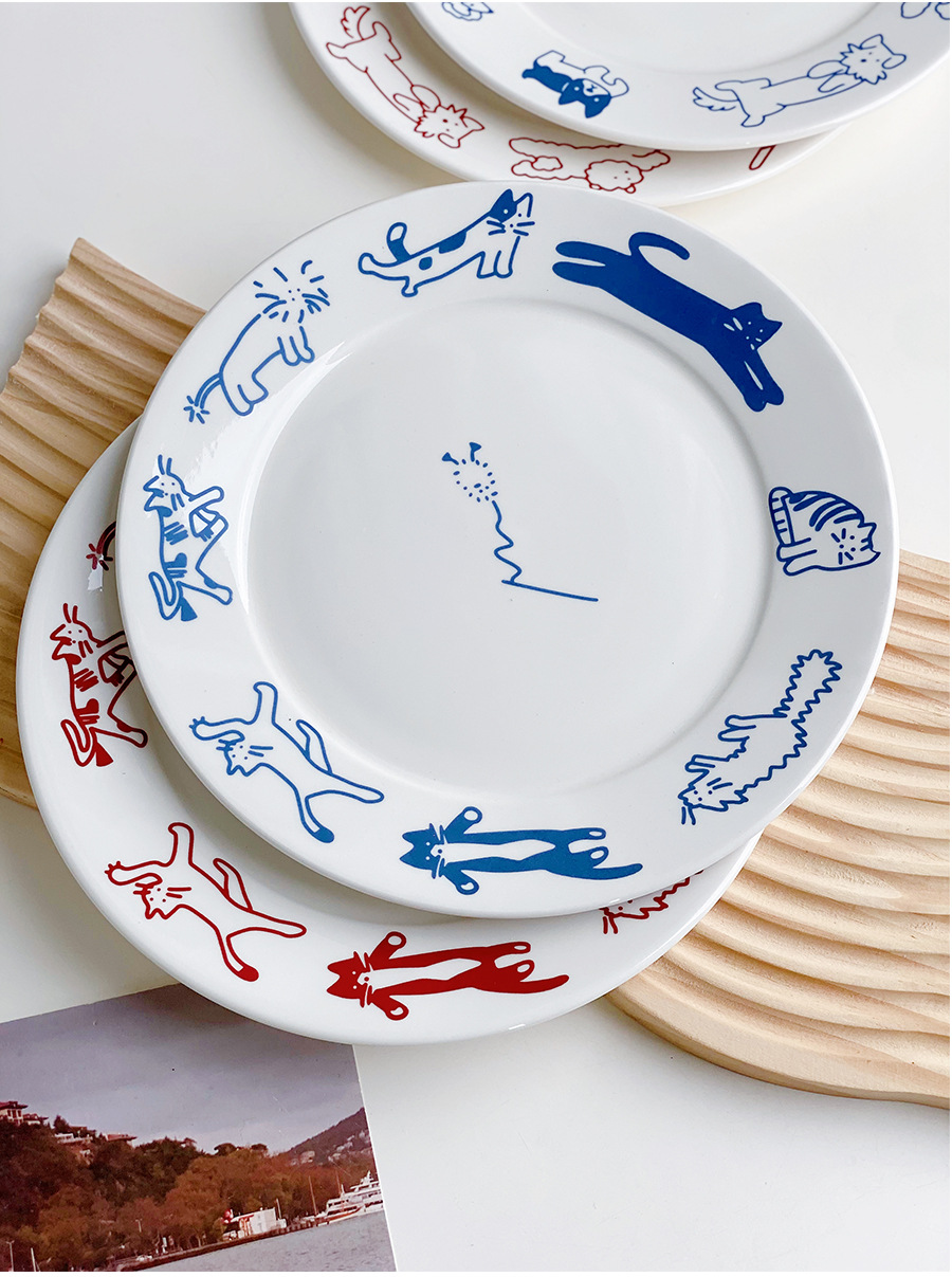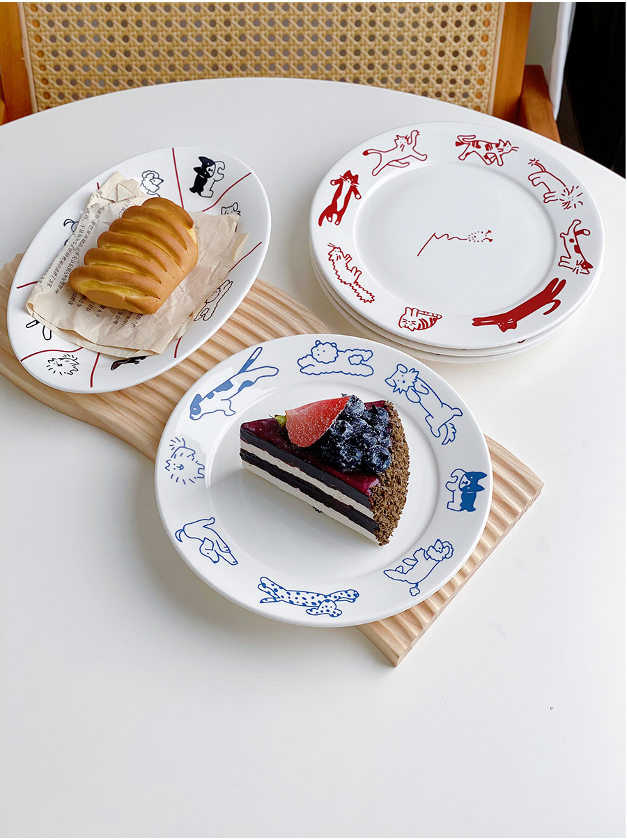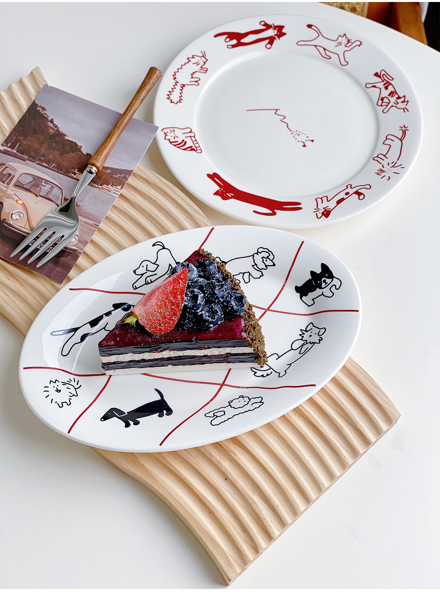 한국 스타일 Ins 스타일 귀여운 인터넷 인기있는 새끼 고양이 강아지 세라믹 디저트 플레이트 케이크 서양 음식 플랫 플레이트 파그 과일 디스크