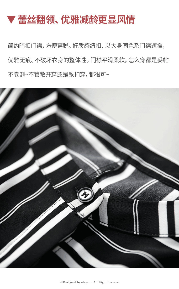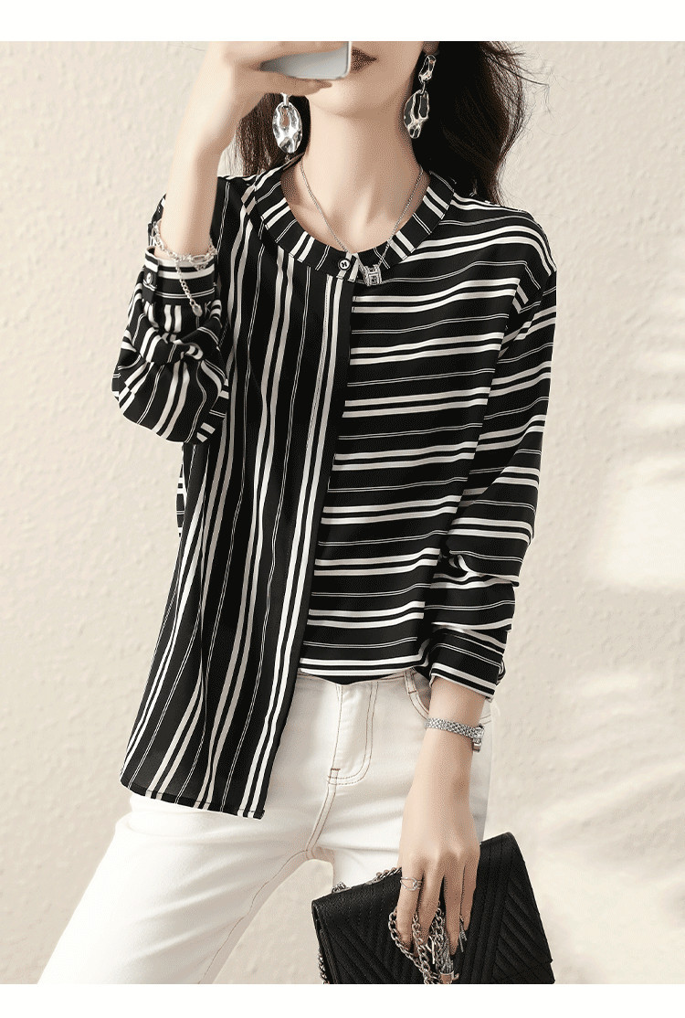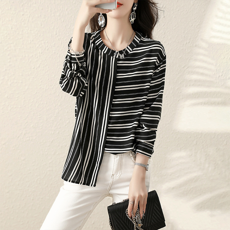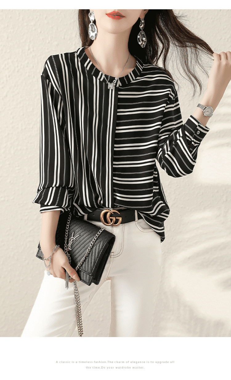 재고 2024 새로운 줄무늬 쉬폰 반팔 셔츠 여성의 우아한 칼라 슬림 탑