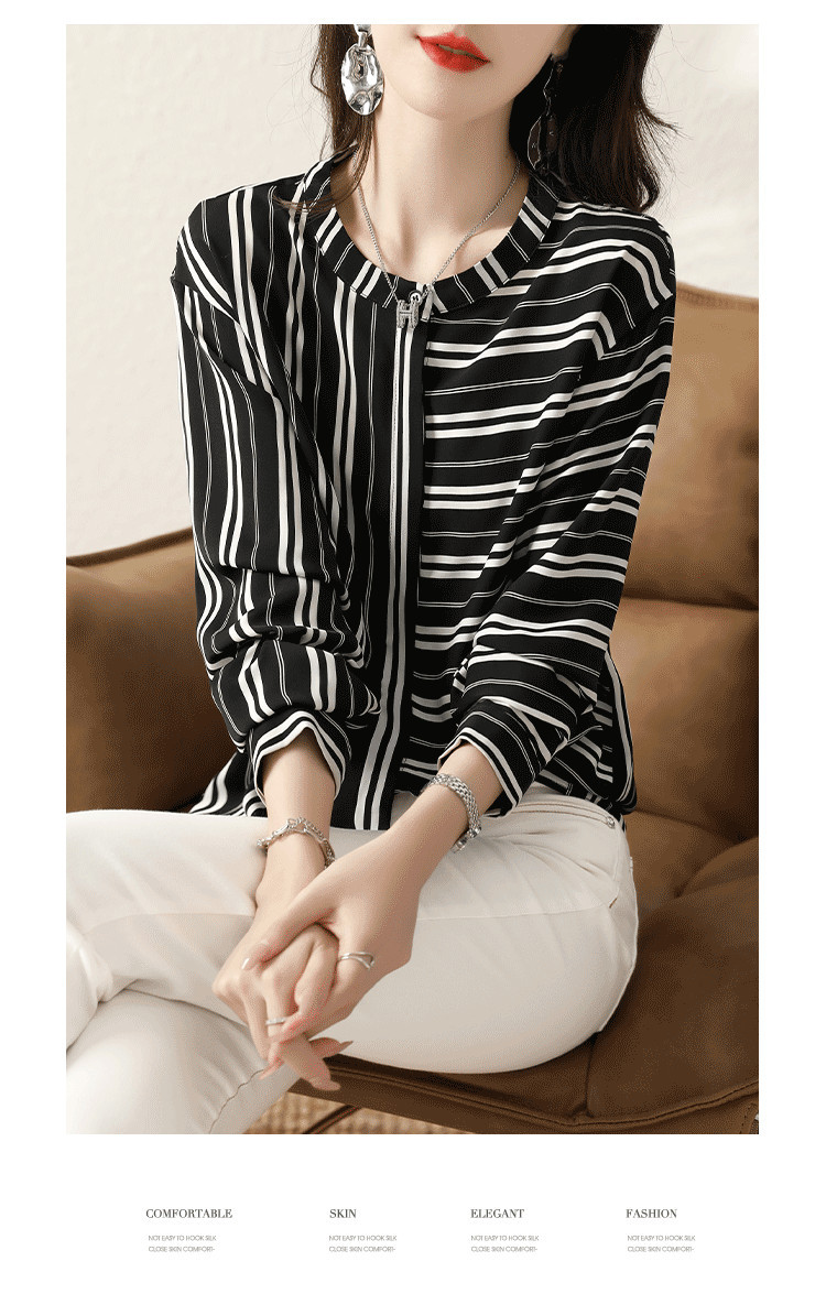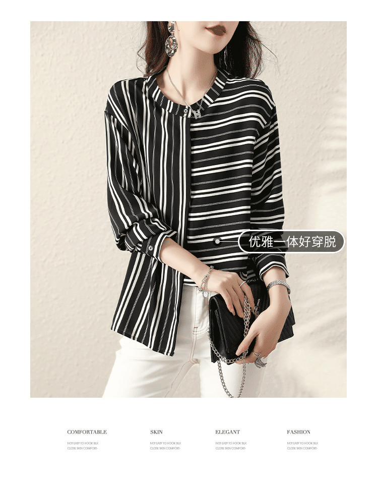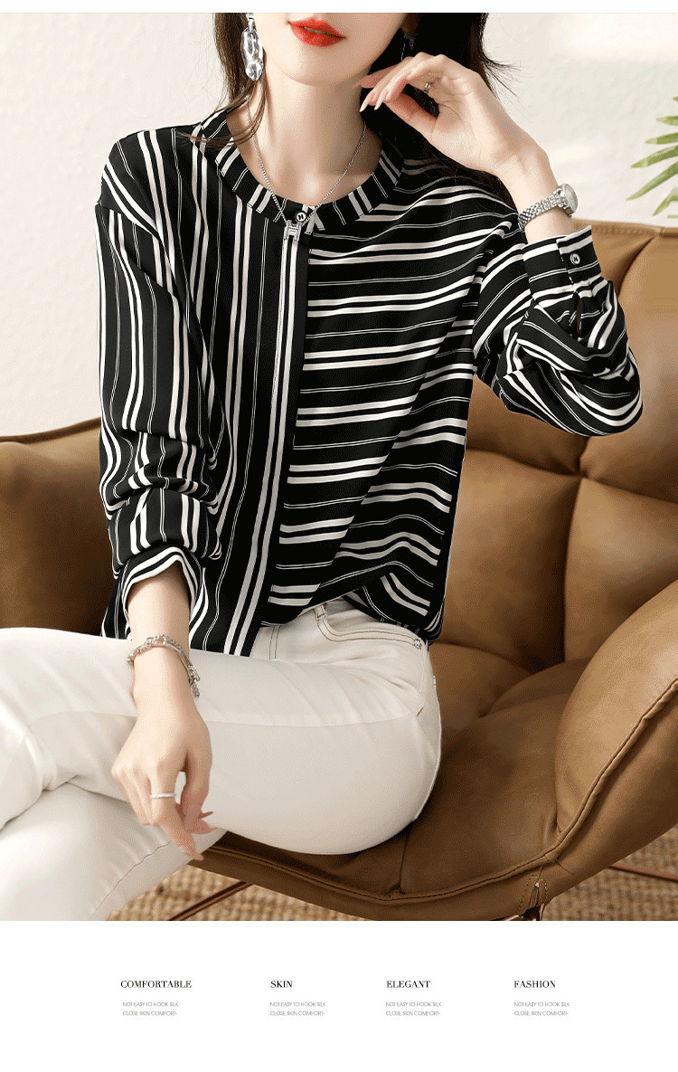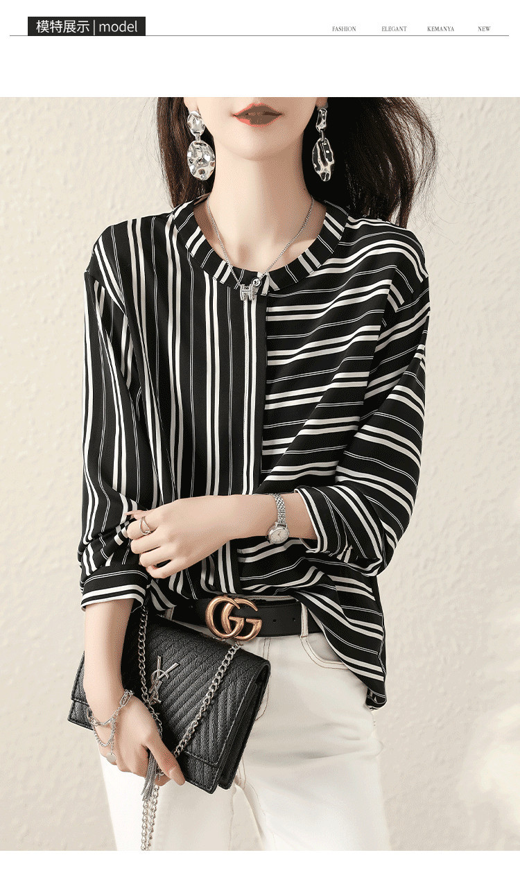 재고 2024 새로운 줄무늬 쉬폰 반팔 셔츠 여성의 우아한 칼라 슬림 탑
