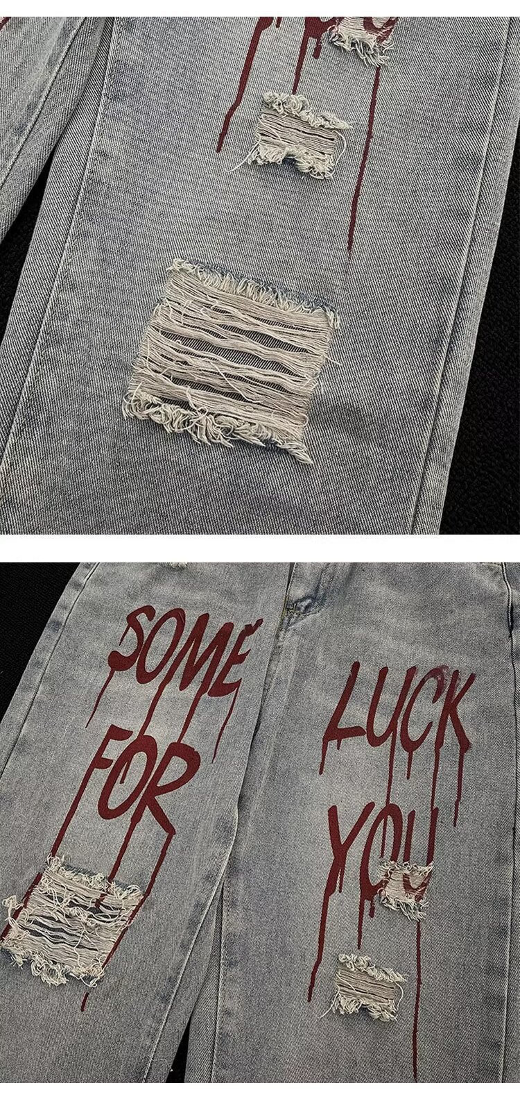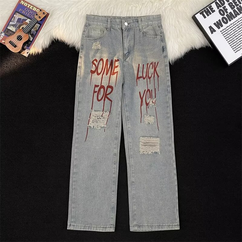 하이 스트리트 힙합 세척 오래 된 찢어진 편지 인쇄 청바지 남자의 유행 브랜드 스트레이트 다리 넓은 다리 느슨한 커플의 바지