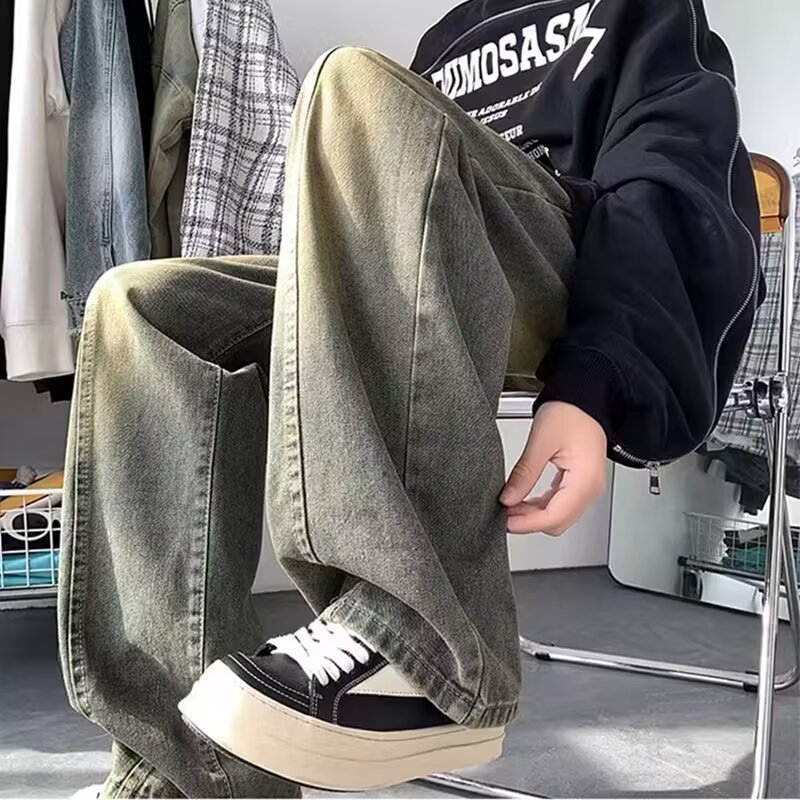 아메리칸 스타일 레트로 올드 옐로우 머드 세탁 청바지 남성 봄과 가을 하이 스트리트 바이브 패션 스트레이트 와이드 레그 바지스토어 가기