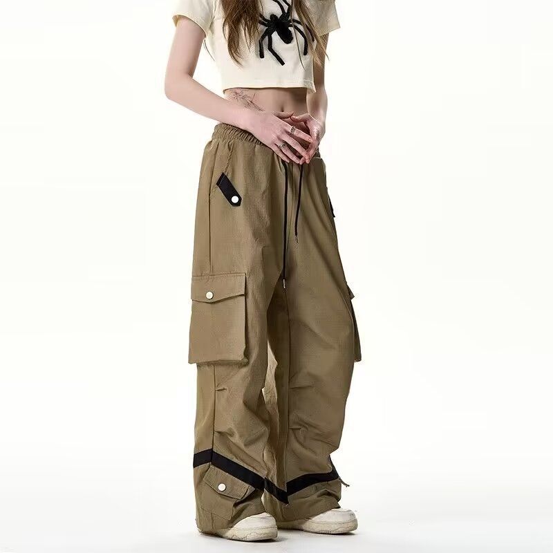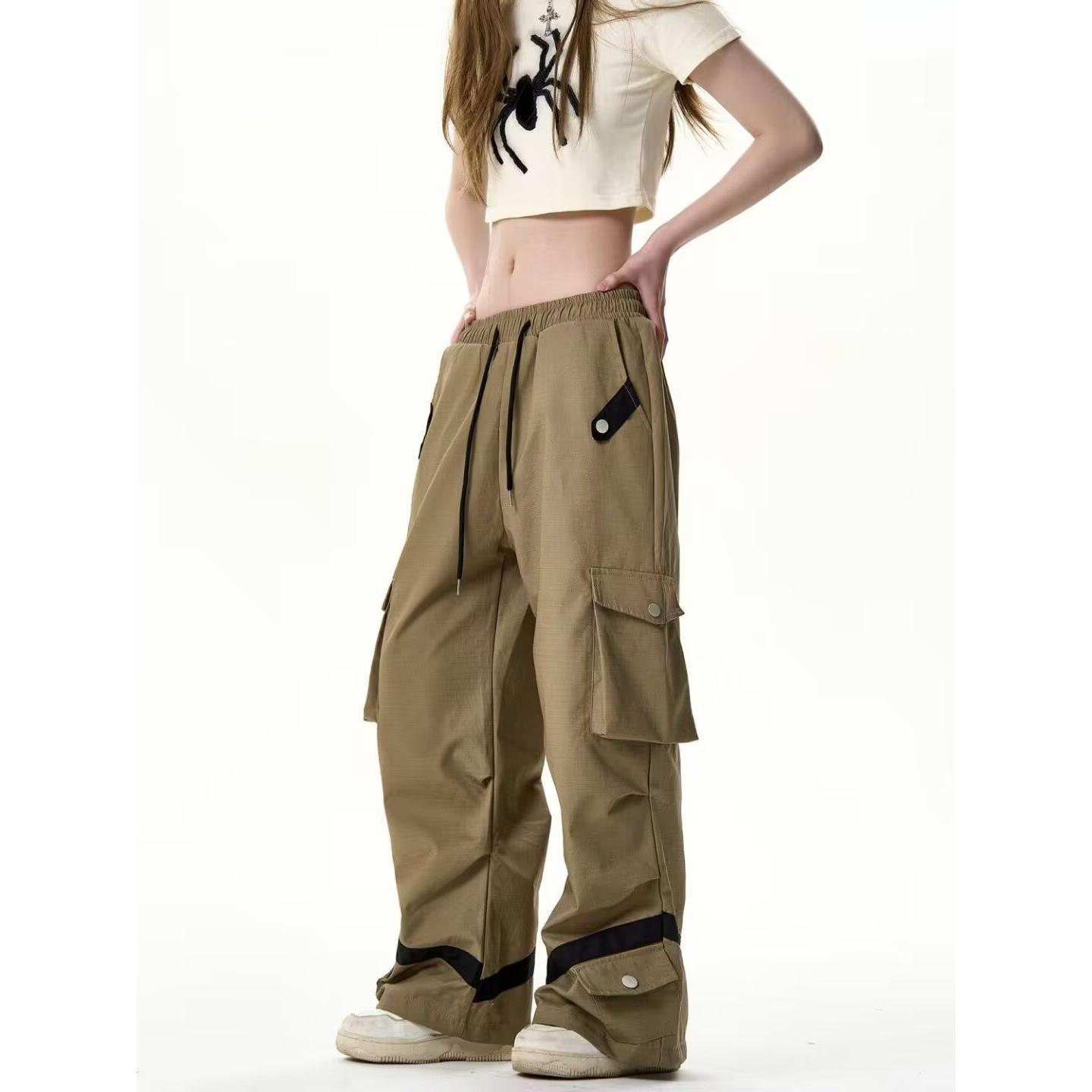 남성과 여성의 복고풍 느슨한 캐주얼 바지 봄과 가을 Ins Drawstring 아메리칸 스타일 하이 스트리트 오버롤 야외 대비 컬러 스트레이트 바지스토어 가기
