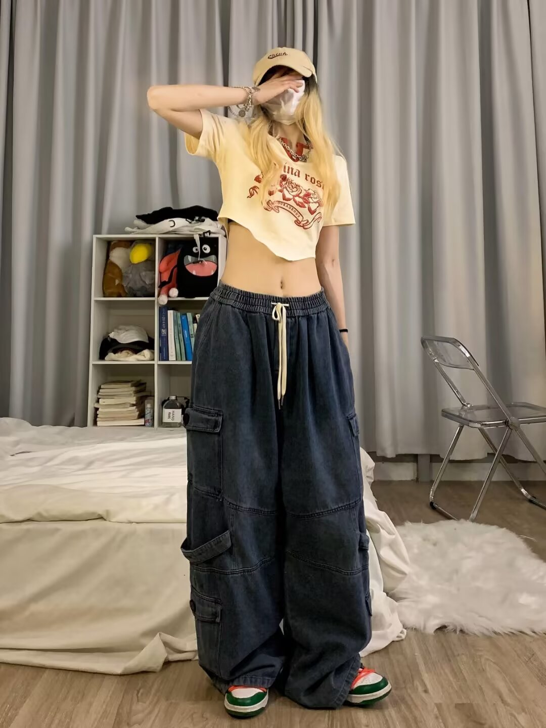 전국 트렌디 인 아메리칸 스타일 레트로 청바지 일본 스타일 작업복 힙합 와이드-다리 느슨한 스트레이트 하이퍼 바지