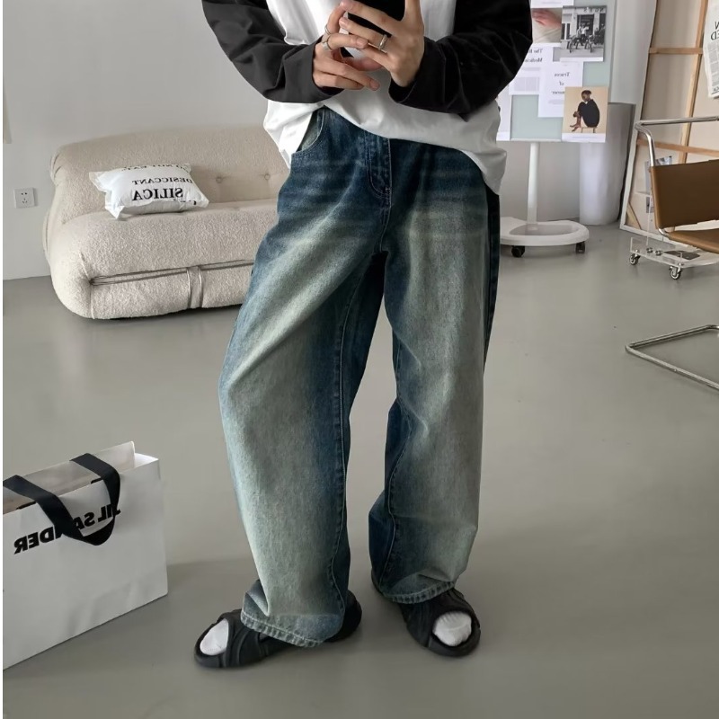 아메리칸 스타일 복고풍 오래 된 청바지 남성 한국 스타일 캐주얼 느슨한 바지 허리 버튼 조정 디자인 스트레이트 바지스토어 가기