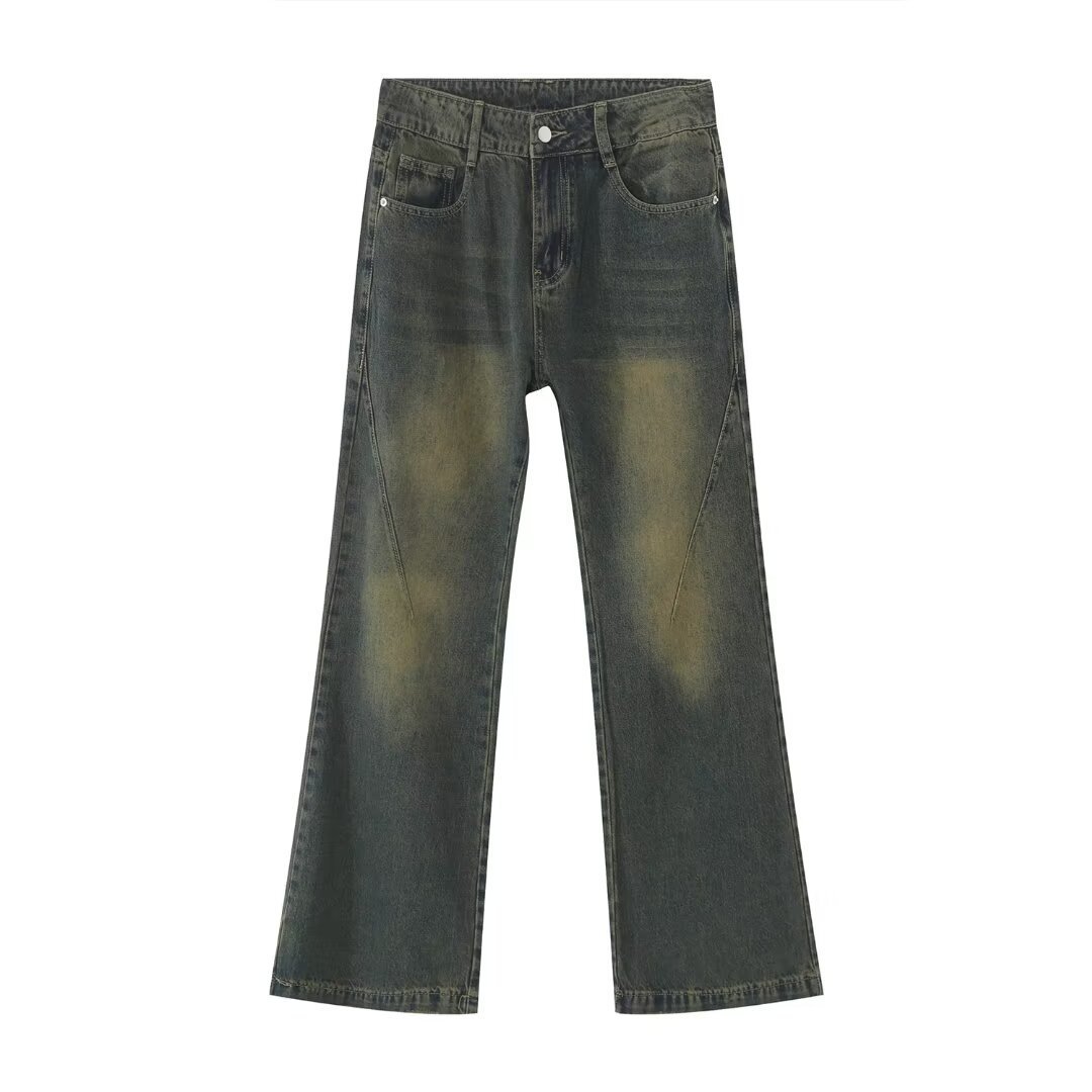 아메리칸 스타일 레트로 딥 루즈 청바지 남성과 여성의 세탁 된 올드 디자인 센스 하이 스트리트 바이브 루즈 스트레이트 팬츠