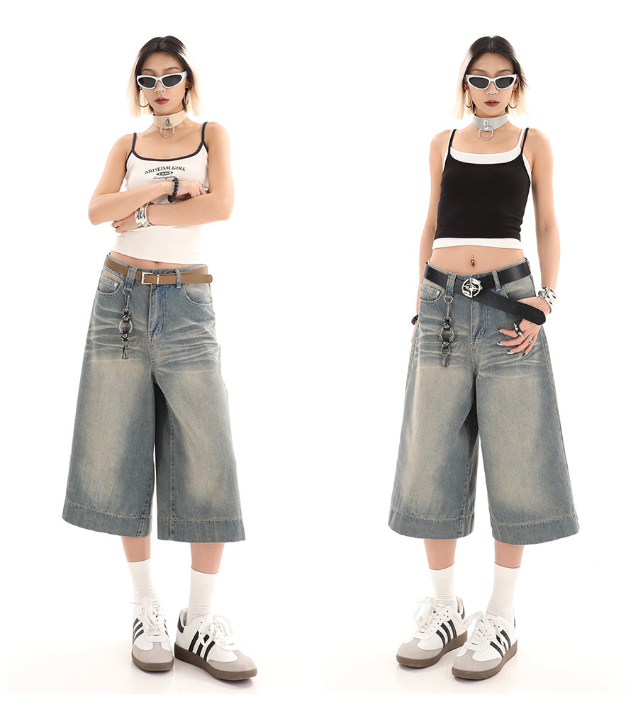 미국 빈티지 엉덩이 데님 반바지 남성 패션 브랜드 하이 스트리트 스트레이트 루즈 세척 오래된 넓은 다리 중간 바지스토어 가기