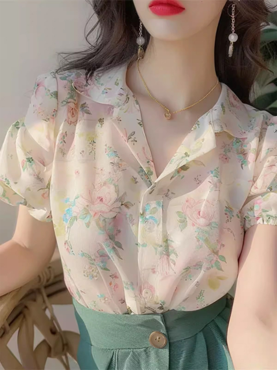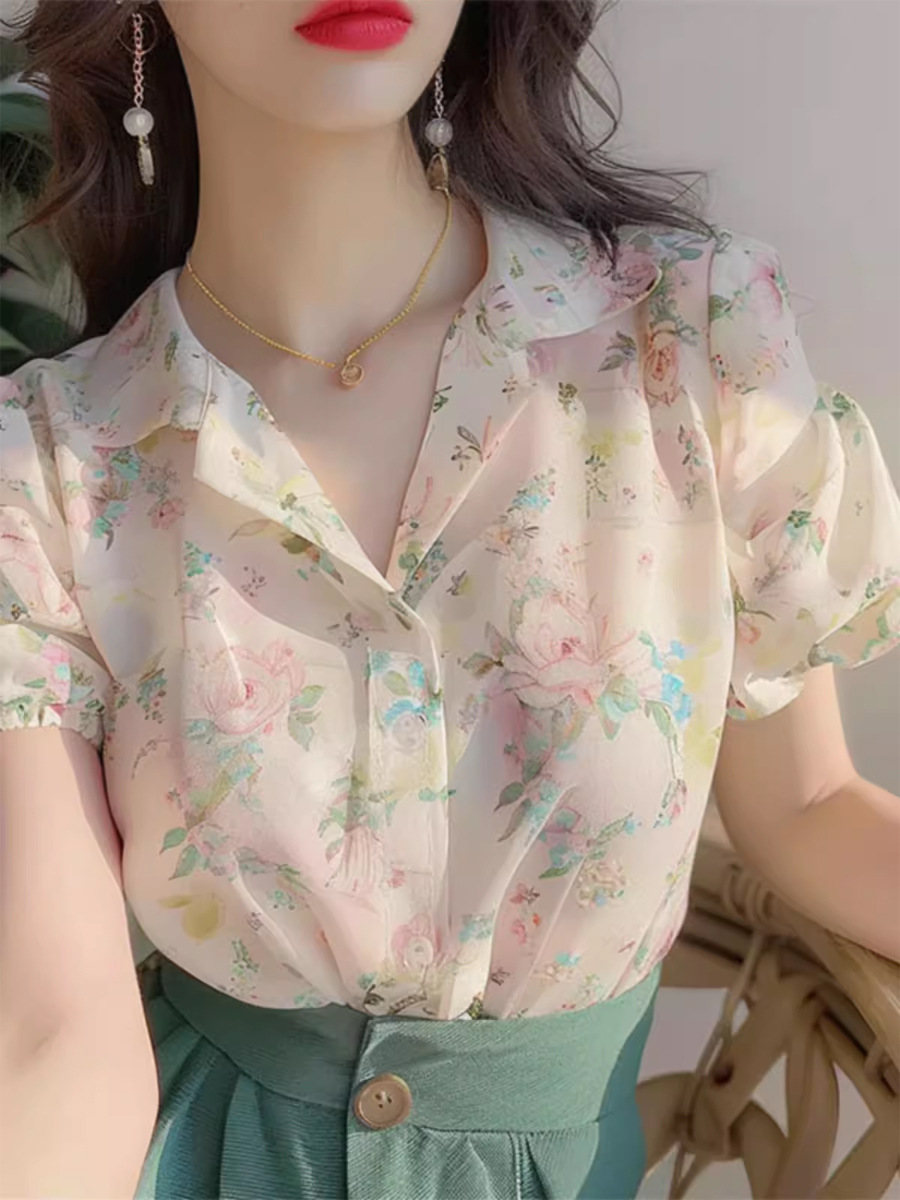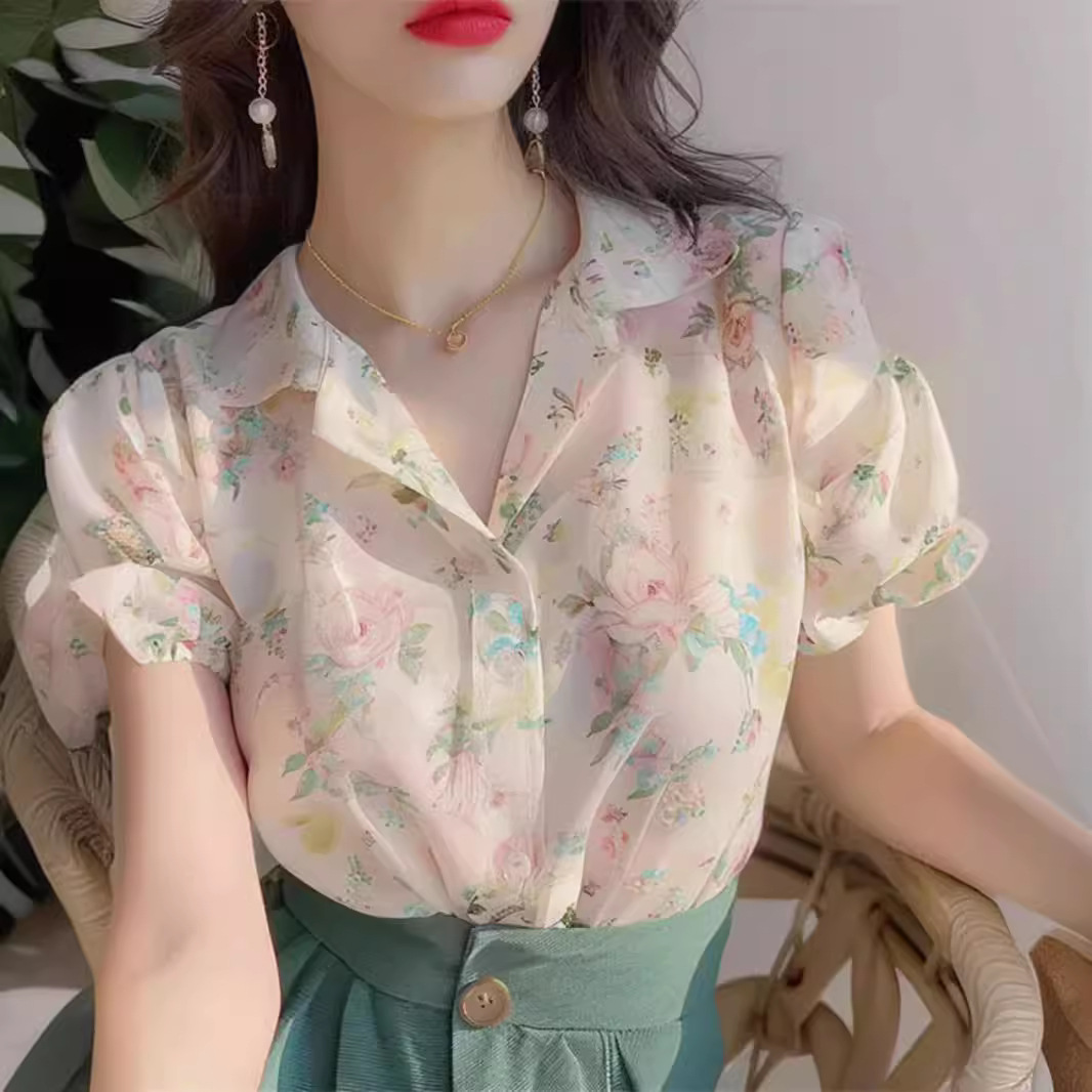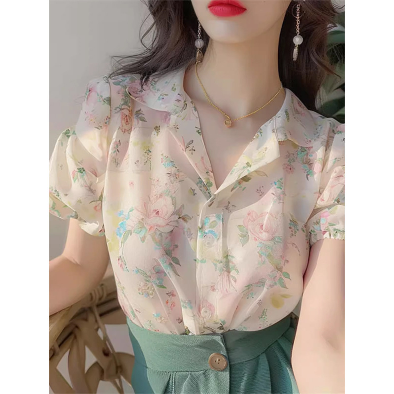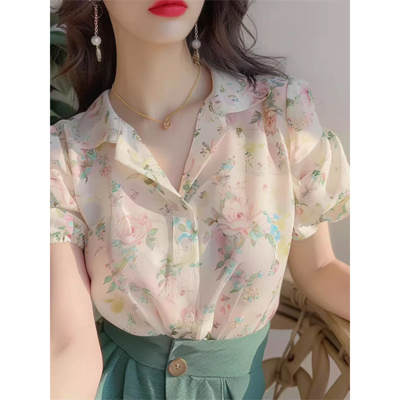 차 브레이크 프랑스 꽃 짧은 소매 셔츠 2024 새로운 여성 한국 세련된 탑 우아한 쉬폰 셔츠