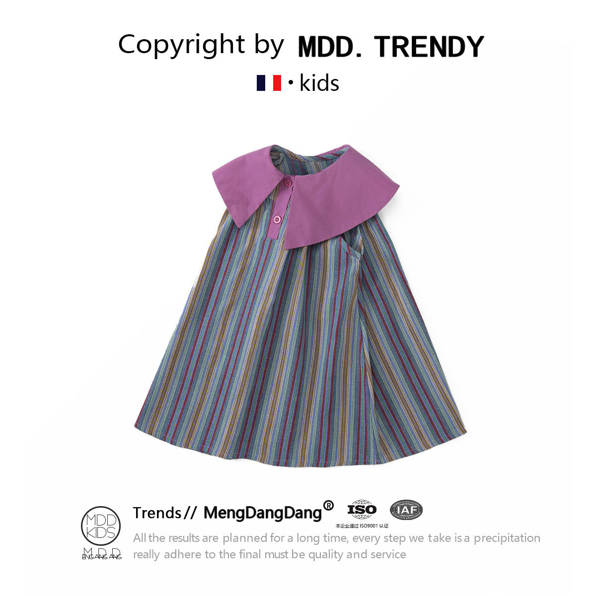 女童裙子夏季2024新款条纹连衣裙无袖娃娃领翻领背心裙森系代发