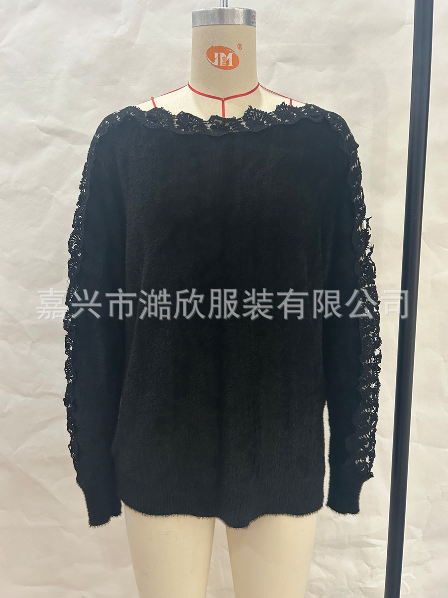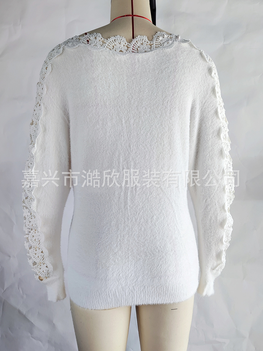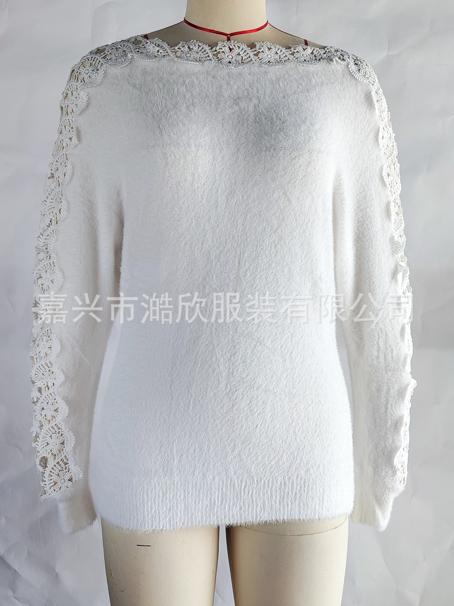 아마존 니트 스웨터 우아한 한 캐릭터 칼라 레이스 바느질 소매 크로스 국경 대외 무역 여성 솔리드 컬러 니트 탑스토어 가기