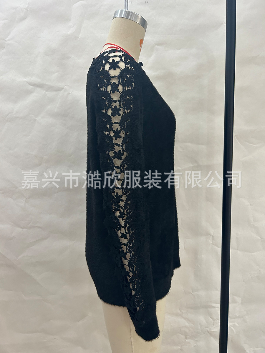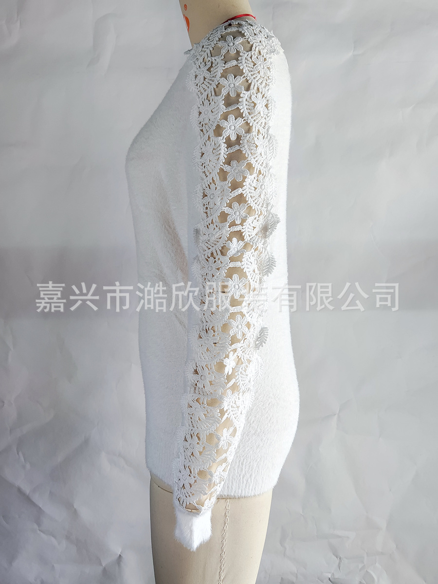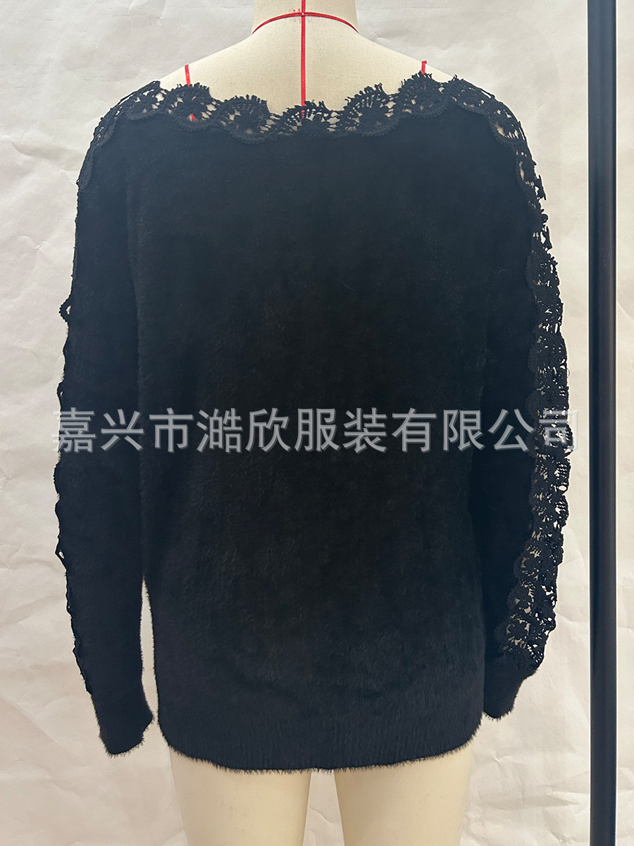 아마존 니트 스웨터 우아한 한 캐릭터 칼라 레이스 바느질 소매 크로스 국경 대외 무역 여성 솔리드 컬러 니트 탑스토어 가기