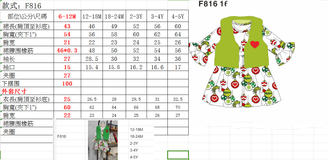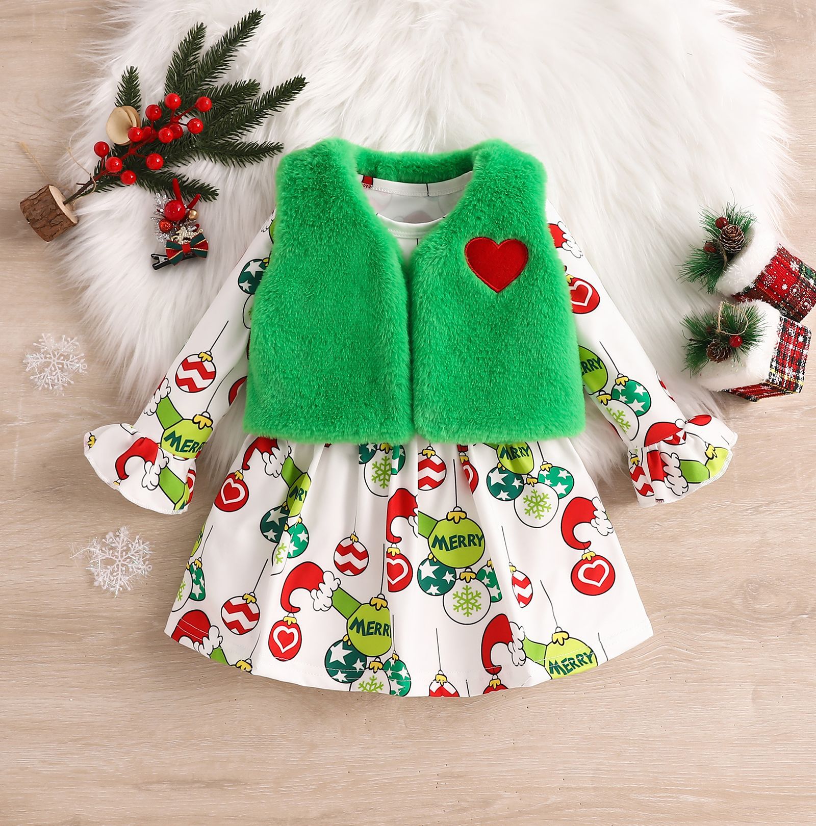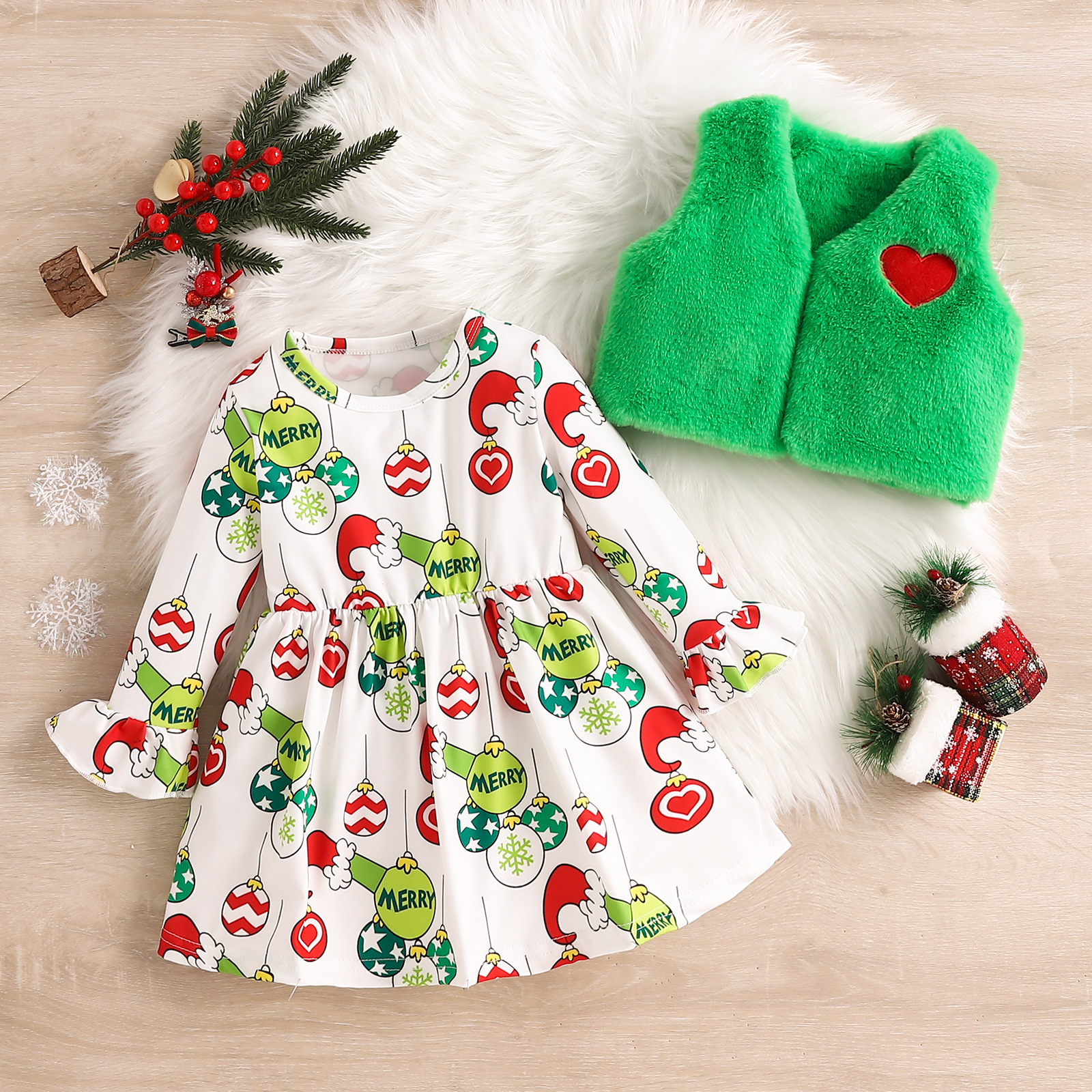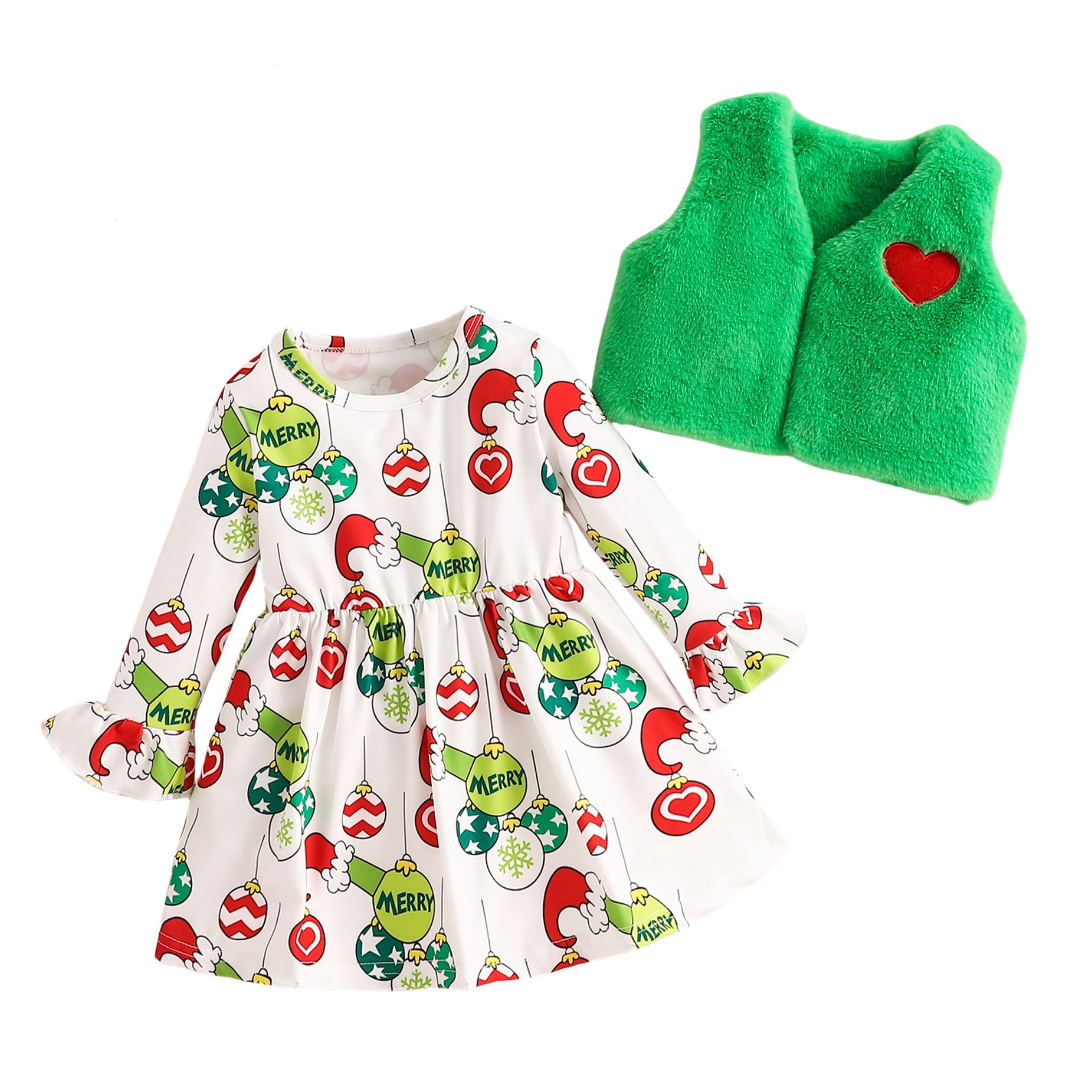 크리스마스 아동복 2024 가을과 겨울 새 소녀 벨 슬리브 크리스마스 인쇄 원피스 플러시 코트 투피스 세트
