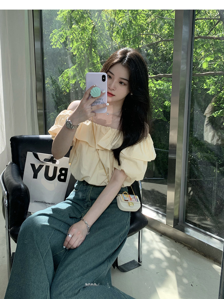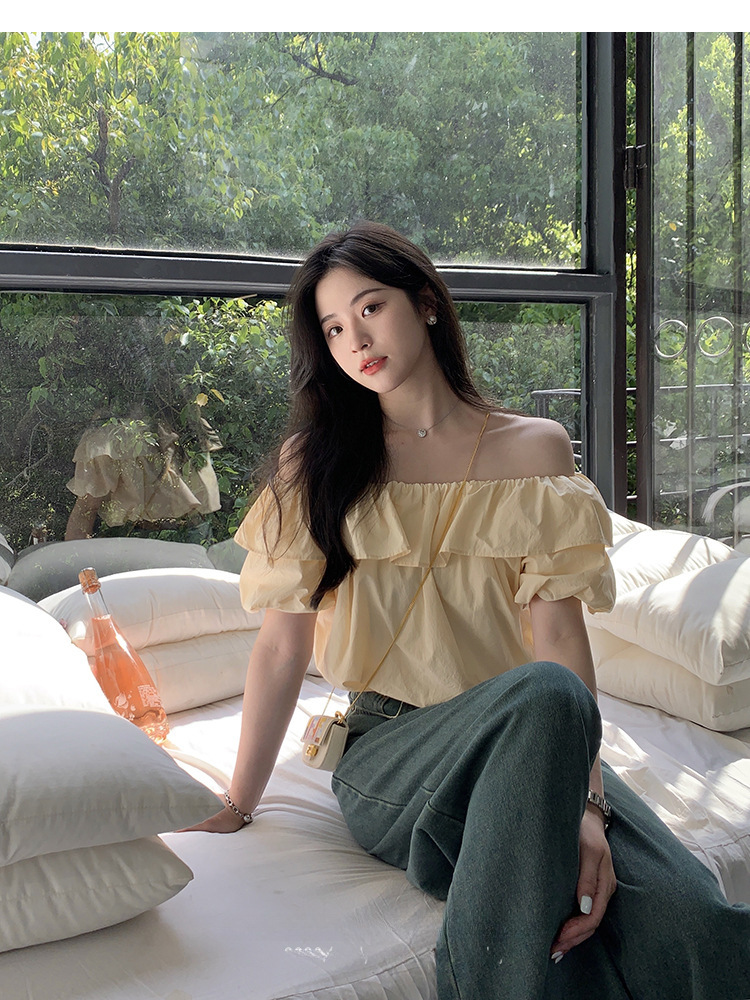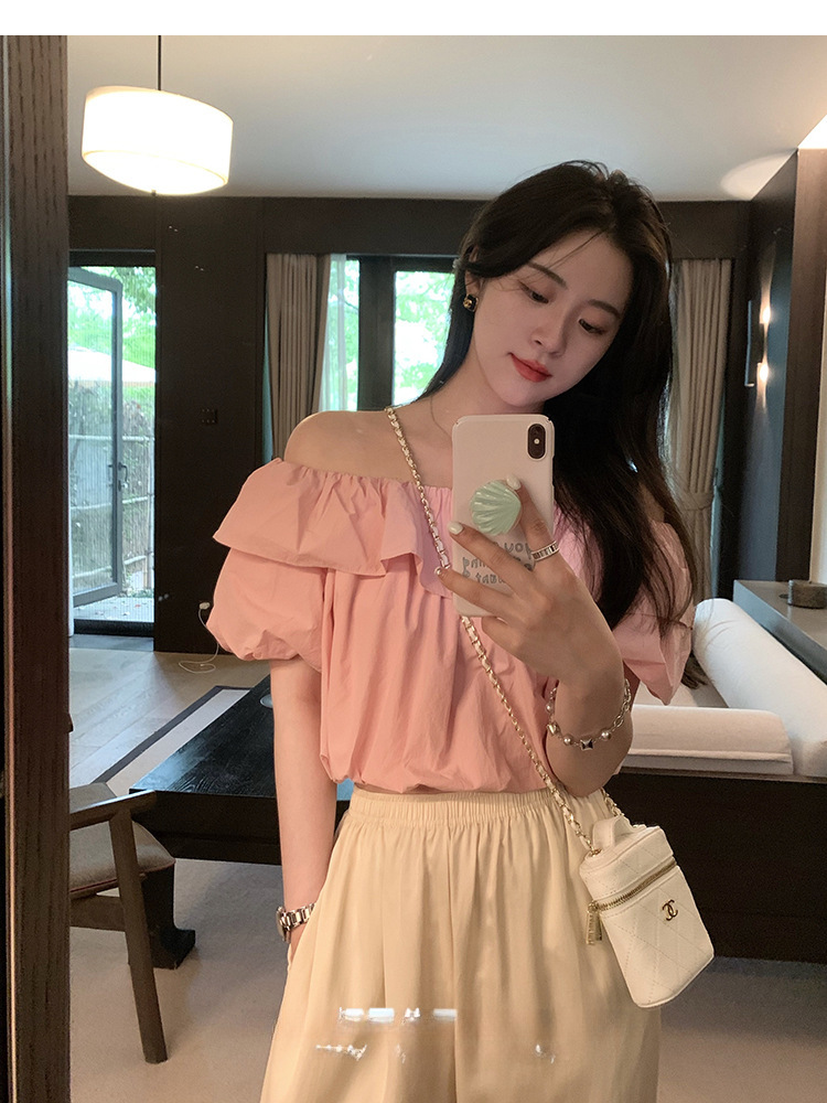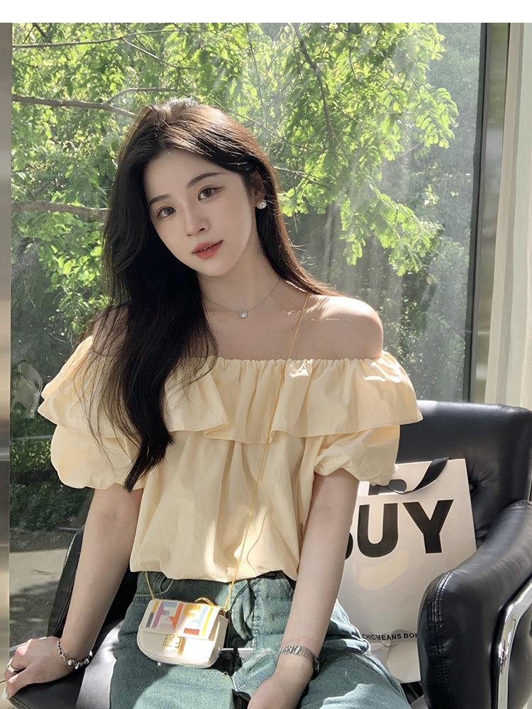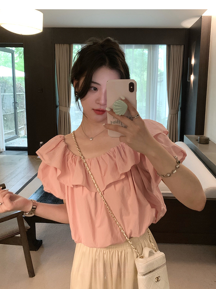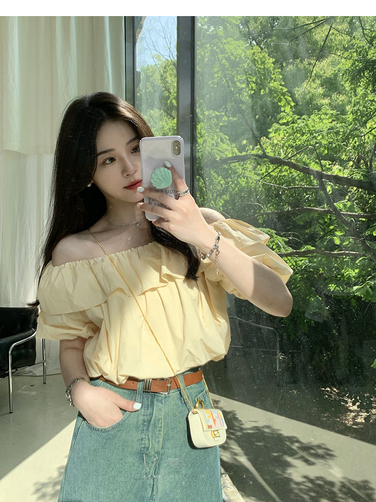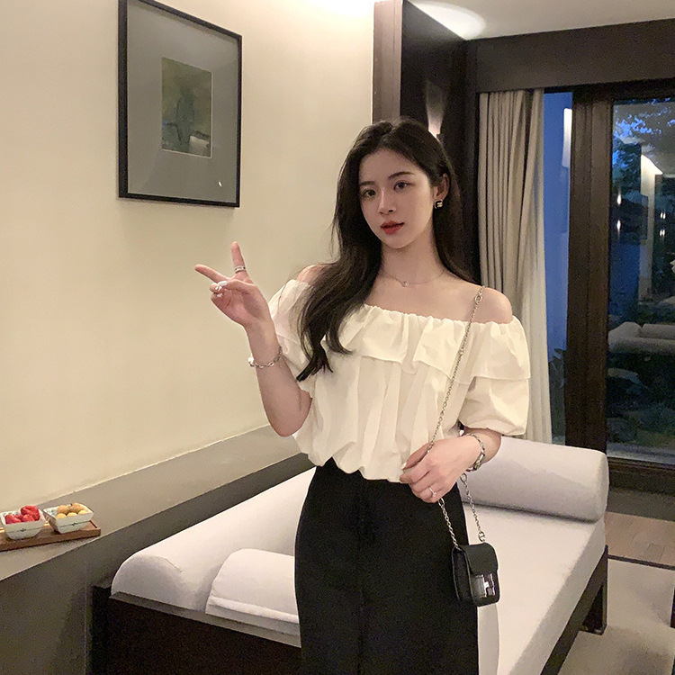 여성을위한 프랑스 복고풍 단색 반팔 핫 소녀 셔츠 여름 한국 스타일 셔츠 쉬폰 원 숄더 짧은 탑 여성 의류스토어 가기
