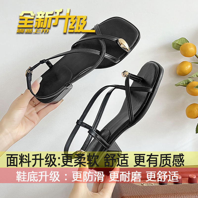 2024 년 여름 새로운 요정 스타일 원피스 프랑스 두꺼운 힐 클립 발가락 로마 비치 신발 용 스트랩이 달린 여성용 샌들스토어 가기
