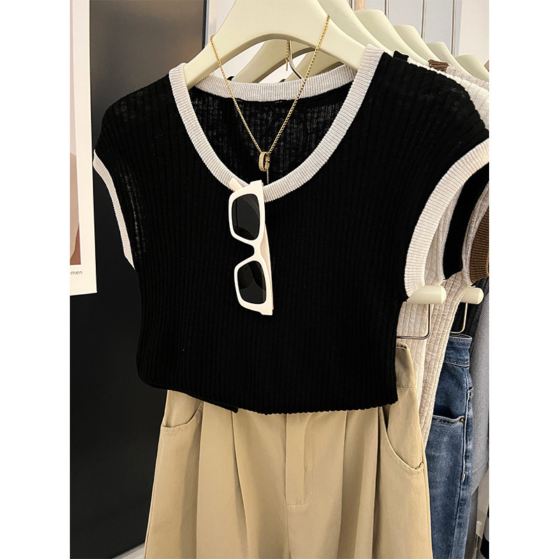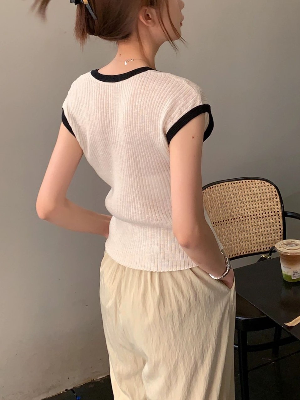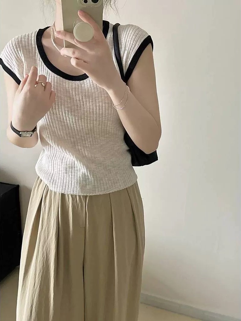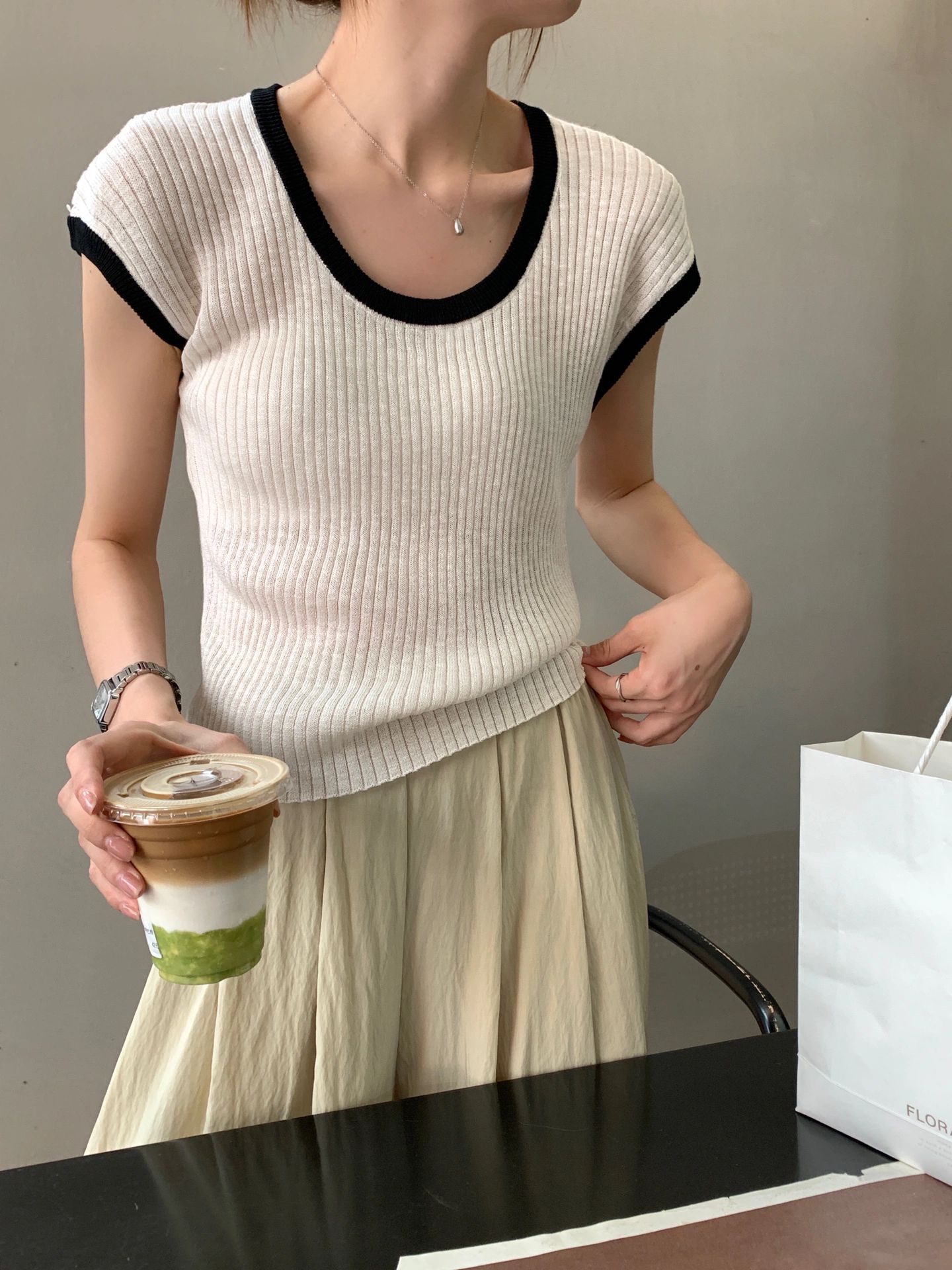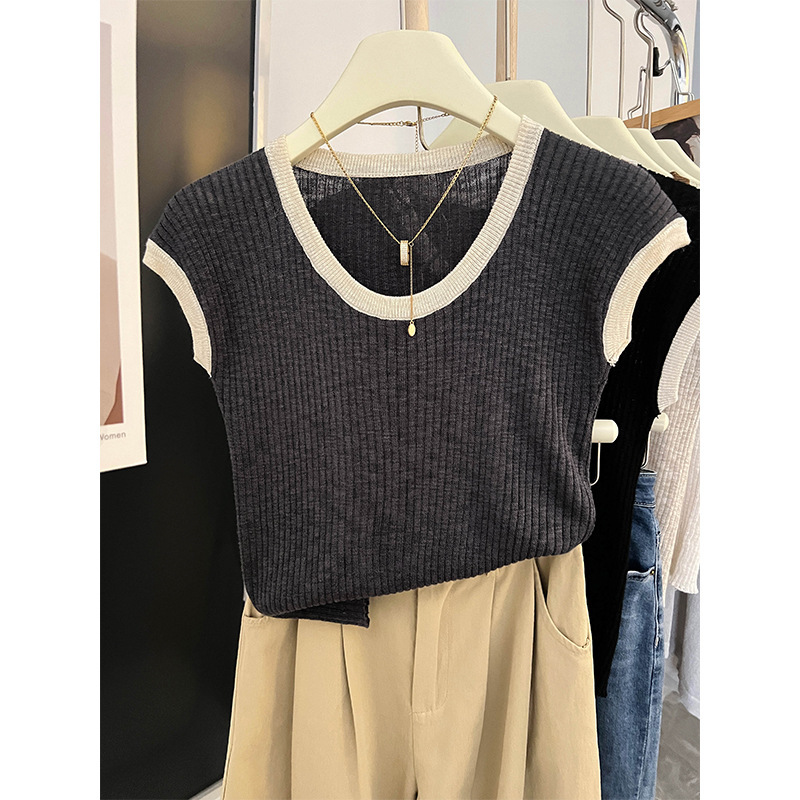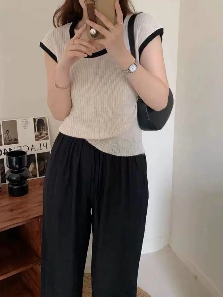 아이스 실크 콘트라스트 컬러 반팔 티셔츠 크루 넥 니트 탑 여성용 2024 여름 새 티셔츠 슬림 핏 피트베이스 셔츠스토어 가기