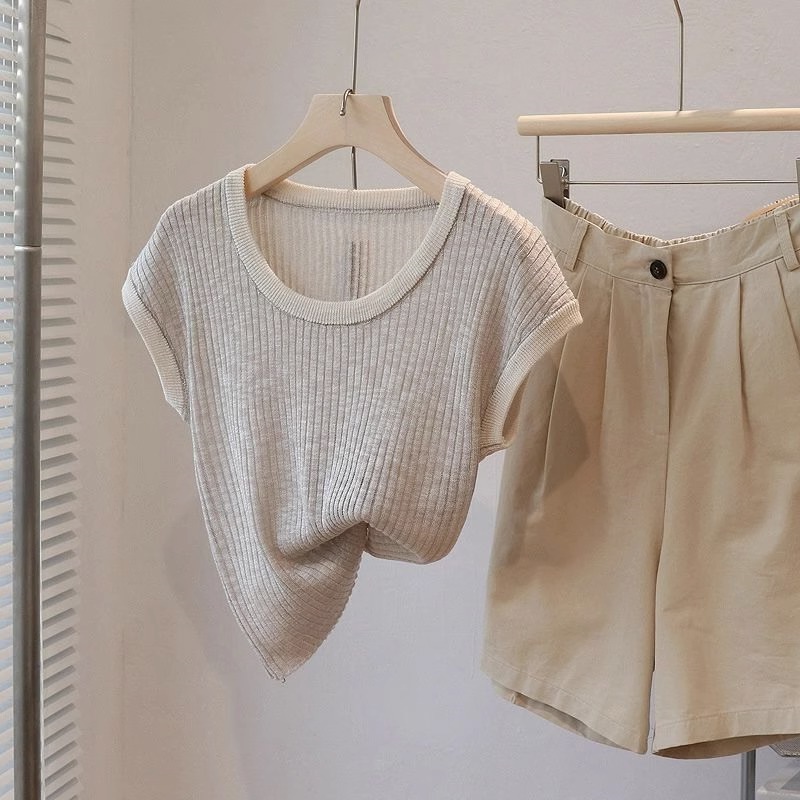 아이스 실크 콘트라스트 컬러 반팔 티셔츠 크루 넥 니트 탑 여성용 2024 여름 새 티셔츠 슬림 핏 피트베이스 셔츠