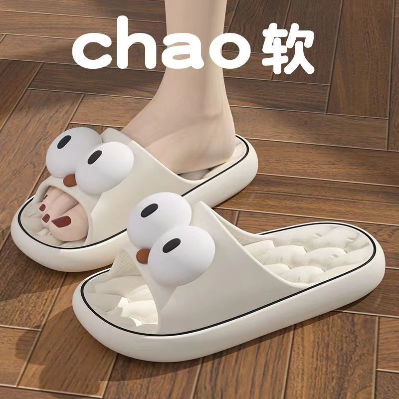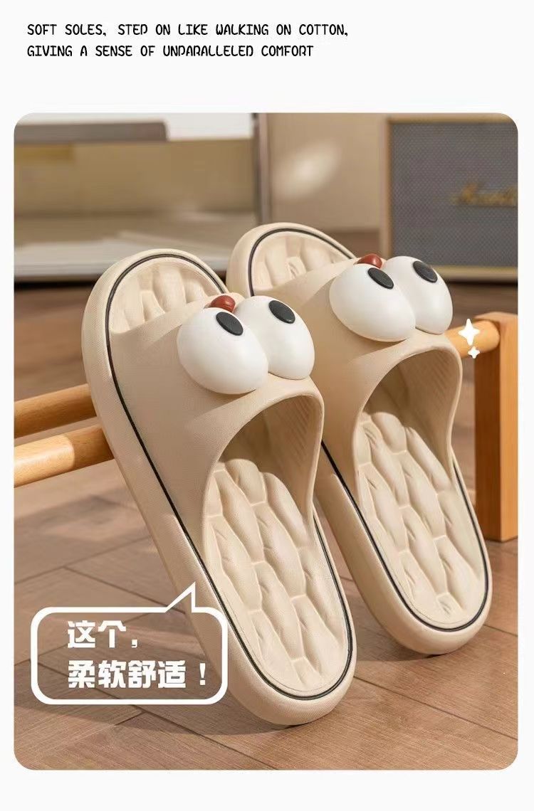 2024 새로운 큰 눈 샌들 및 슬리퍼 여성의 여름 외부 착용 두꺼운 바닥 배설물 느낌 홈 실내 미끄럼 방지 귀여운 슬리퍼