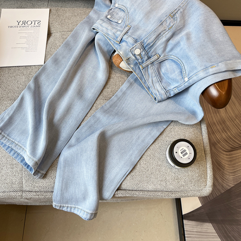 여름 생활 바지 2024 새로운 밝은 색상 담근 텐셀 느슨한 직선 청바지 여성용 높은 허리 바지스토어 가기