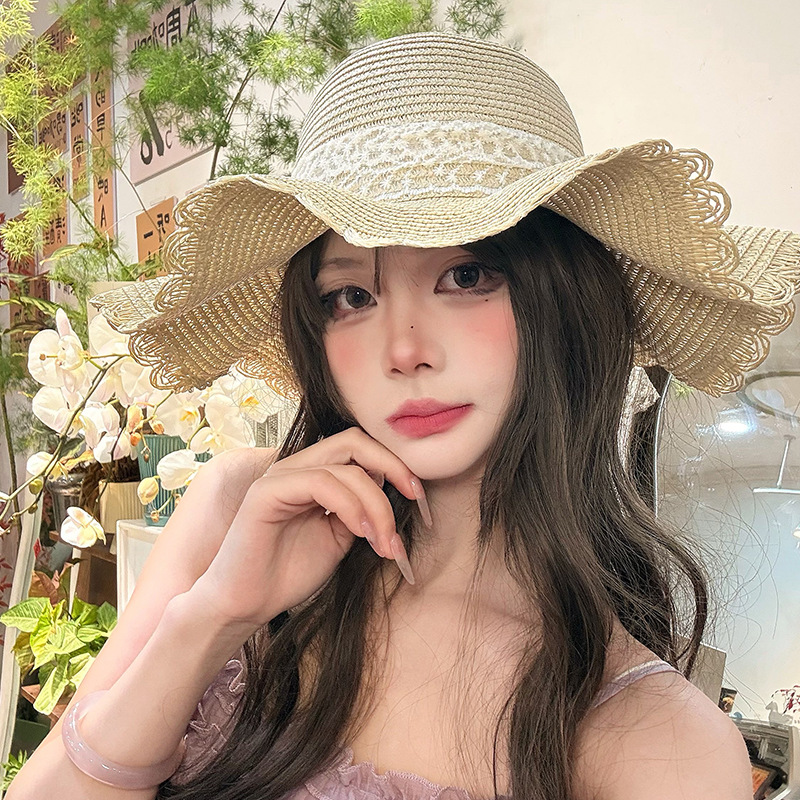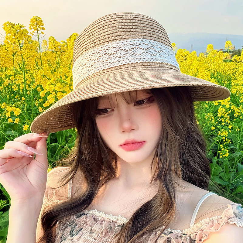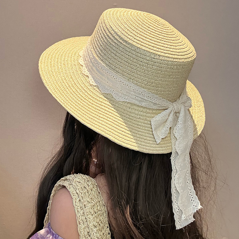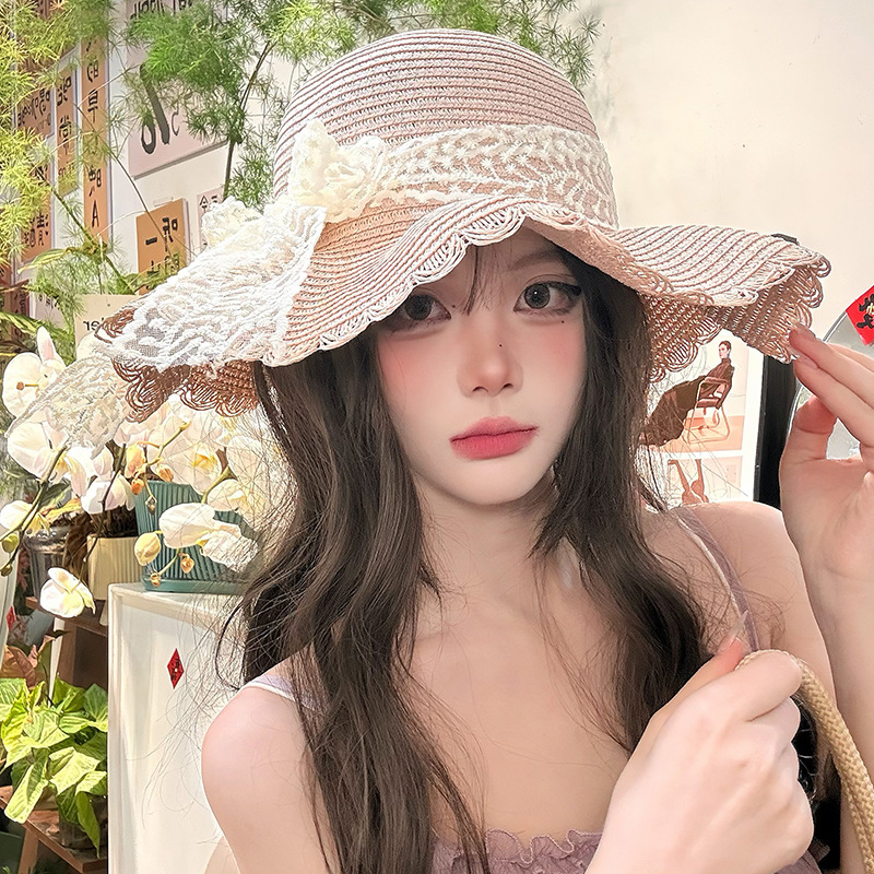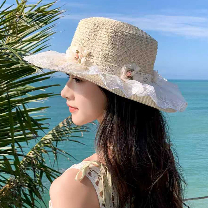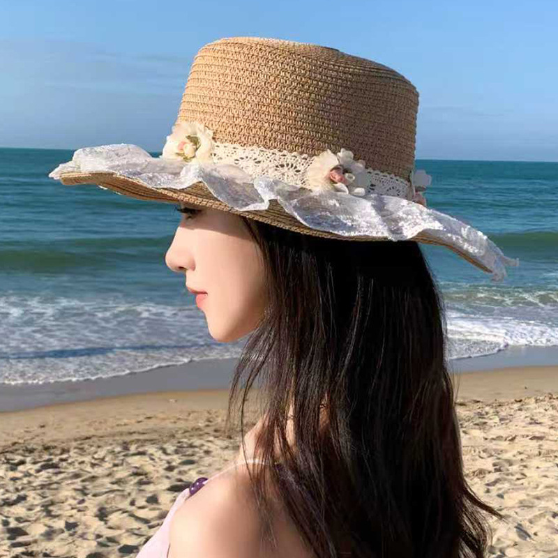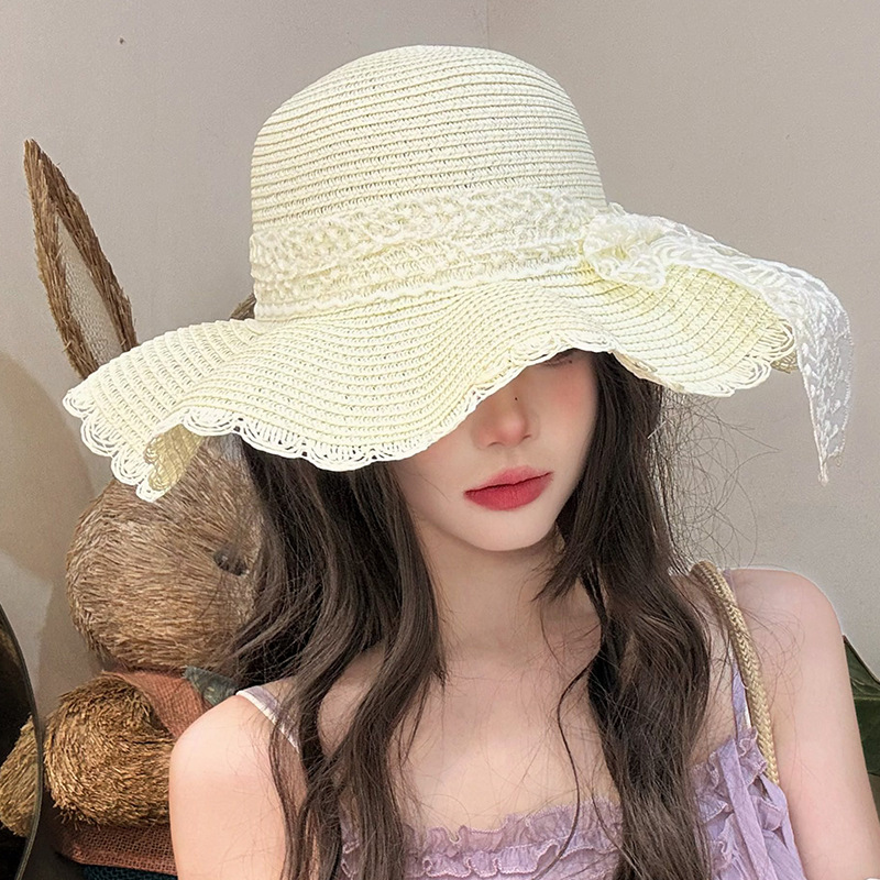 레이스 리본 햇빛 가리개 밀짚모자 여성용 여름용 큰 챙 자외선 차단 모자 해변 휴가용 비치 모자스토어 가기