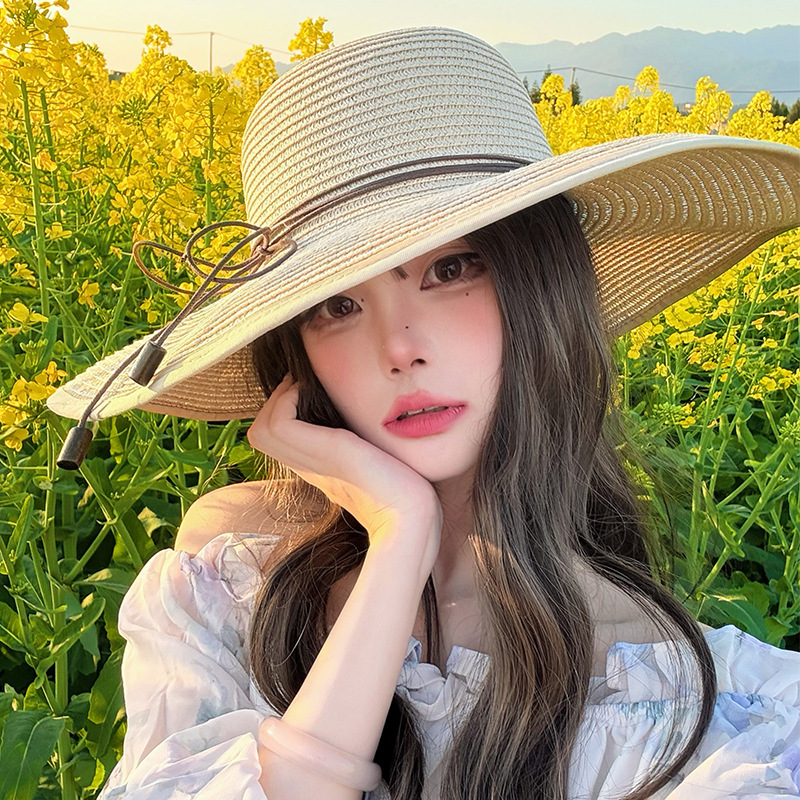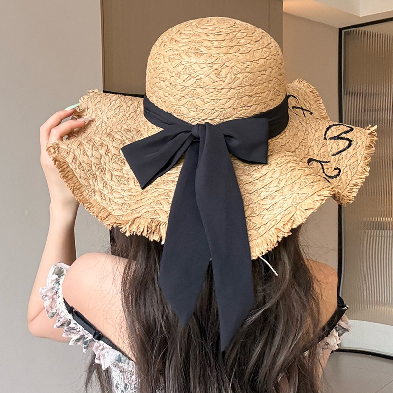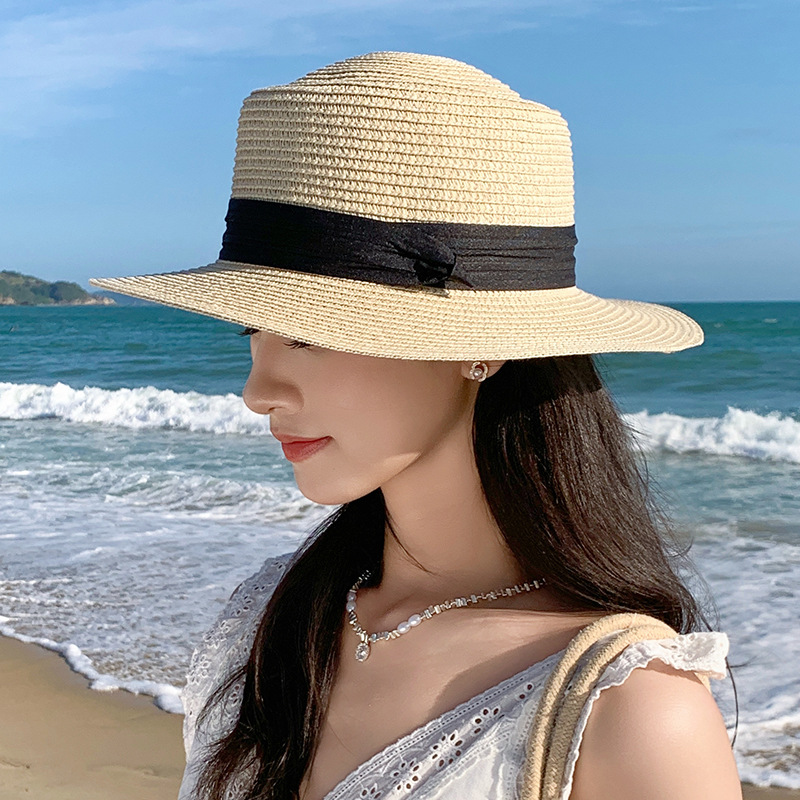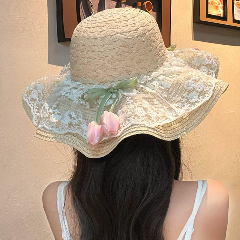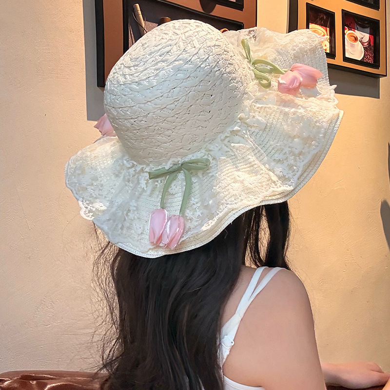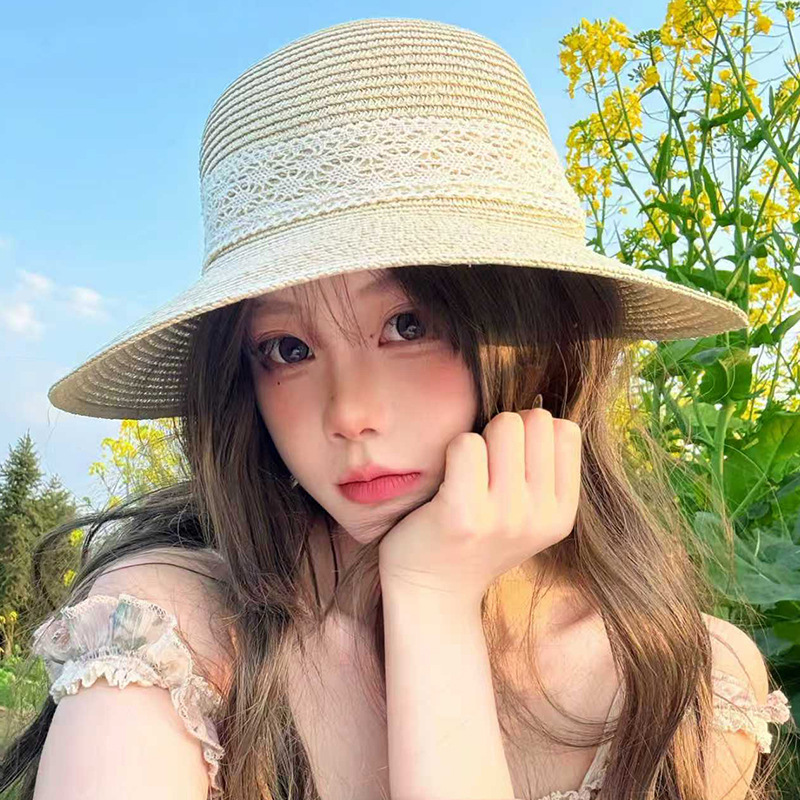 레이스 리본 햇빛 가리개 밀짚모자 여성용 여름용 큰 챙 자외선 차단 모자 해변 휴가용 비치 모자스토어 가기