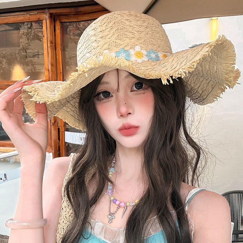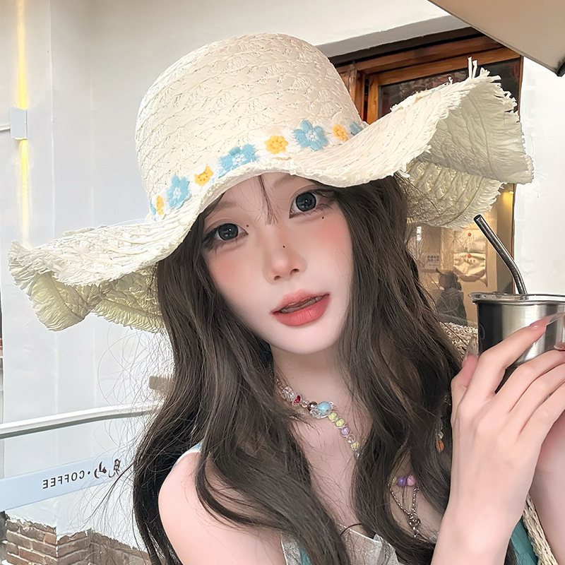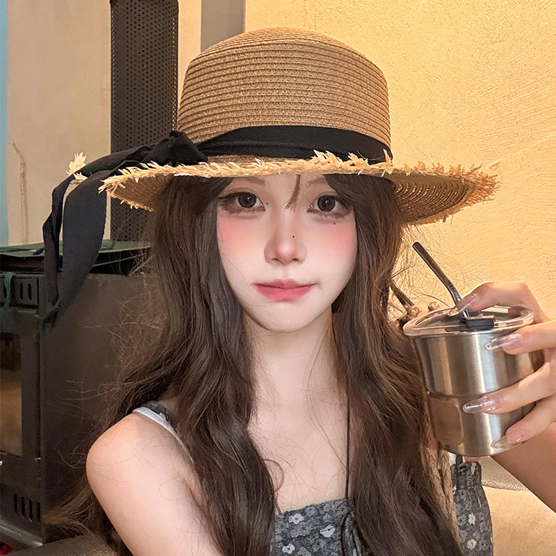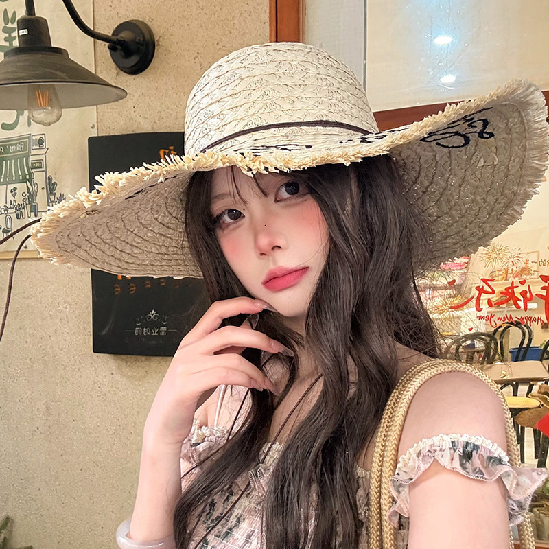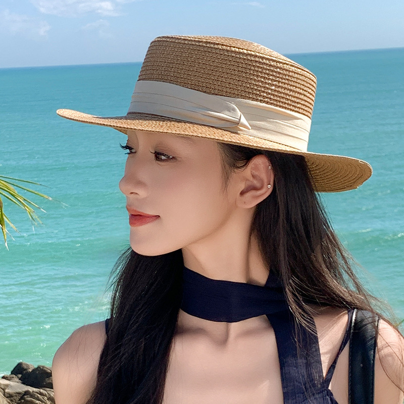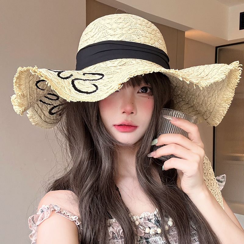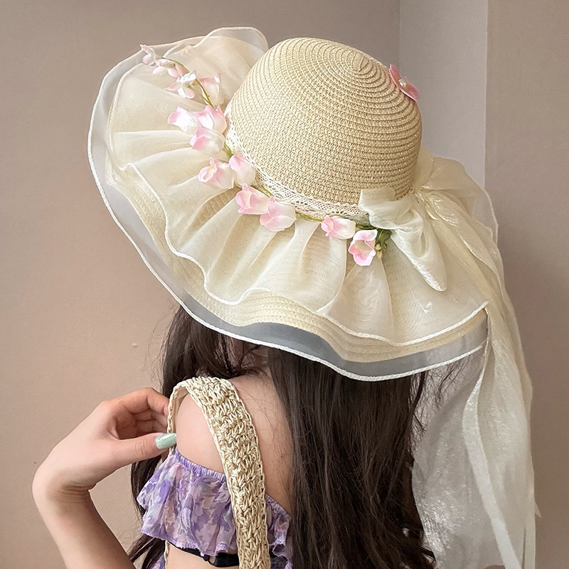 레이스 리본 햇빛 가리개 밀짚모자 여성용 여름용 큰 챙 자외선 차단 모자 해변 휴가용 비치 모자스토어 가기