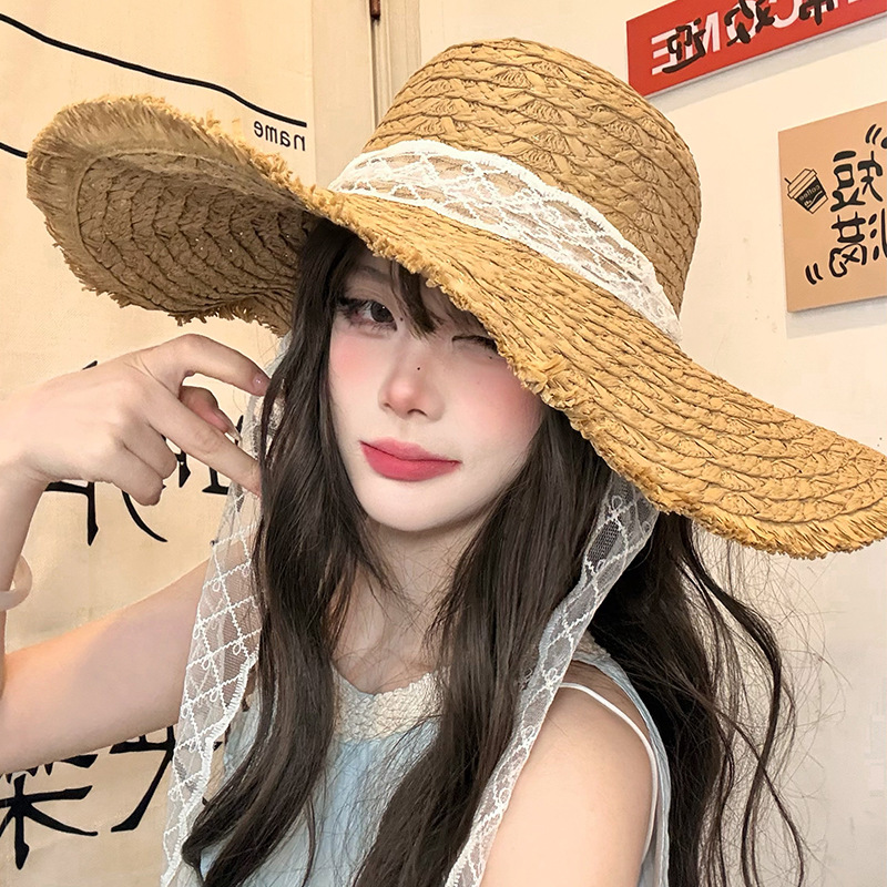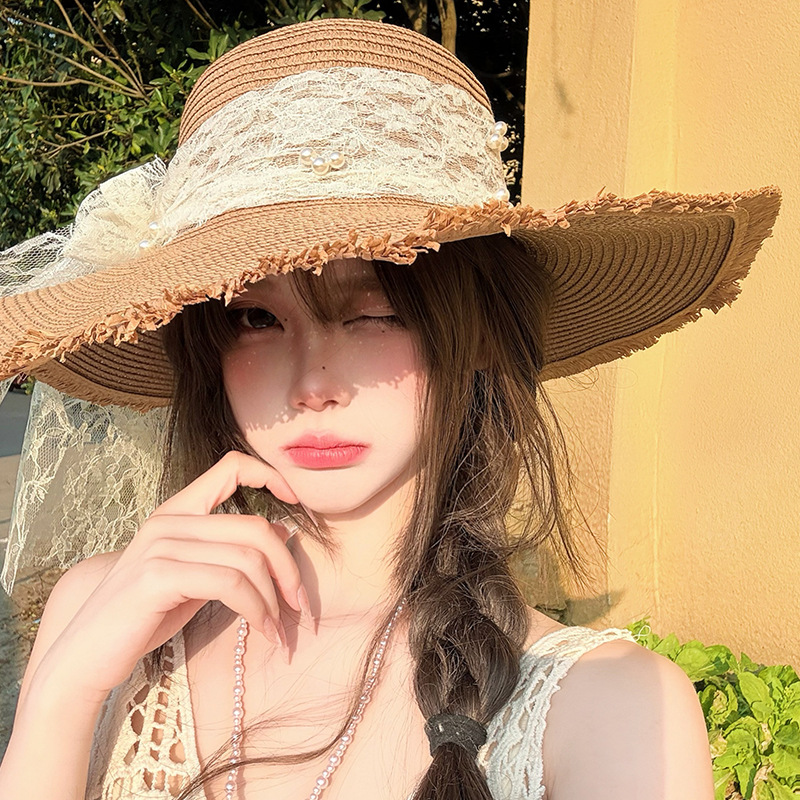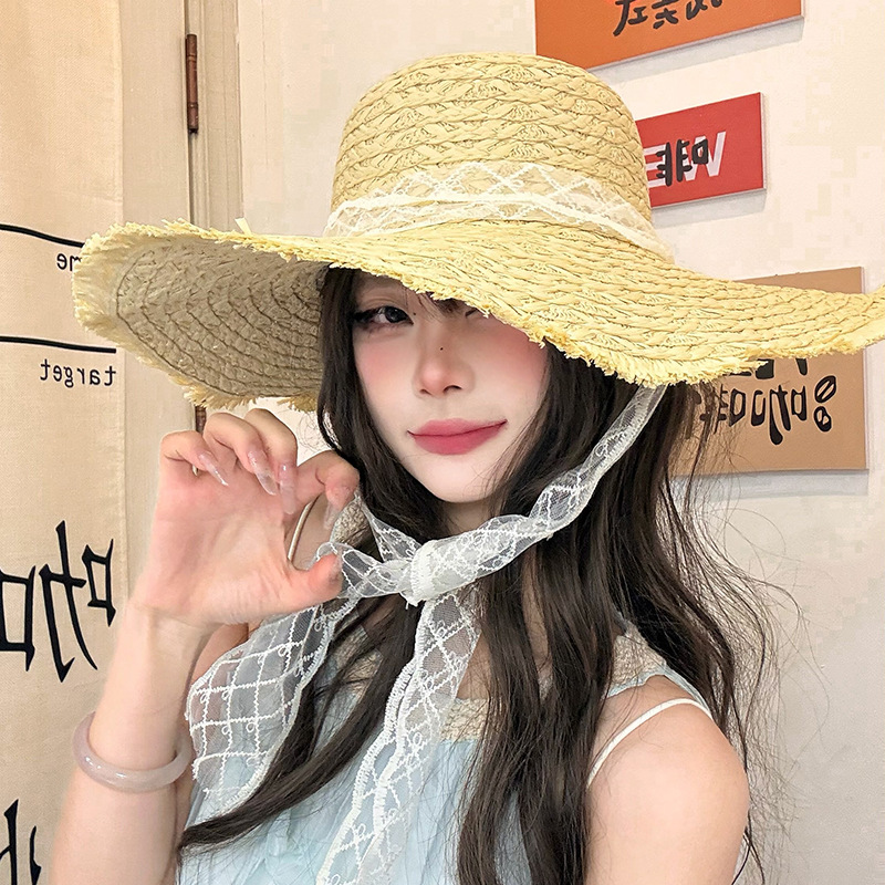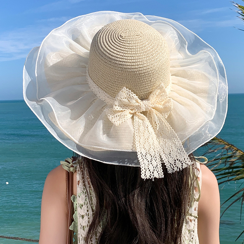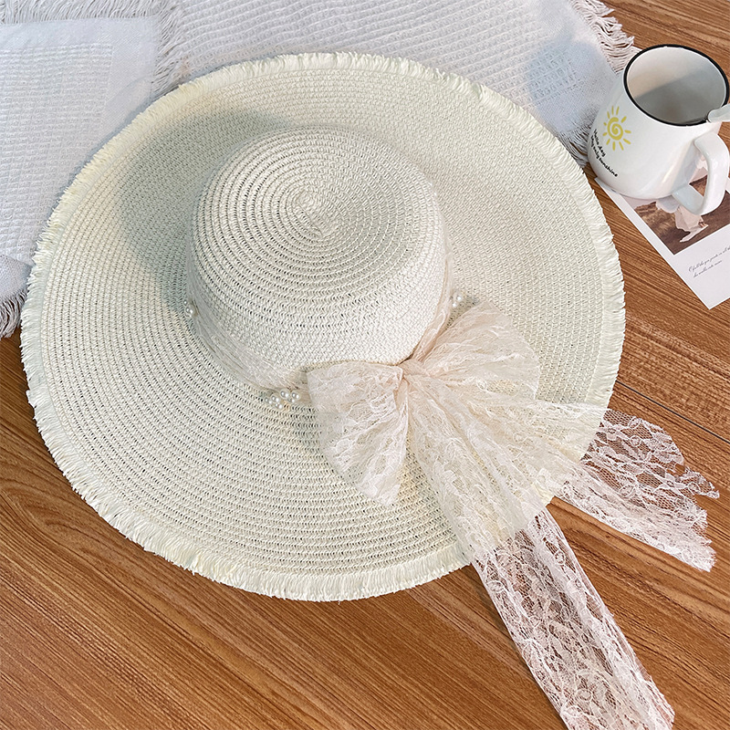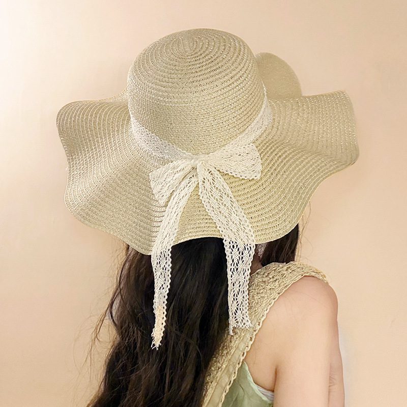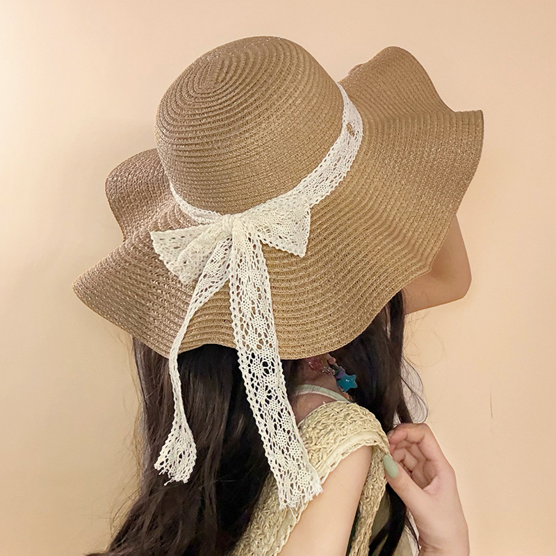 레이스 리본 햇빛 가리개 밀짚모자 여성용 여름용 큰 챙 자외선 차단 모자 해변 휴가용 비치 모자