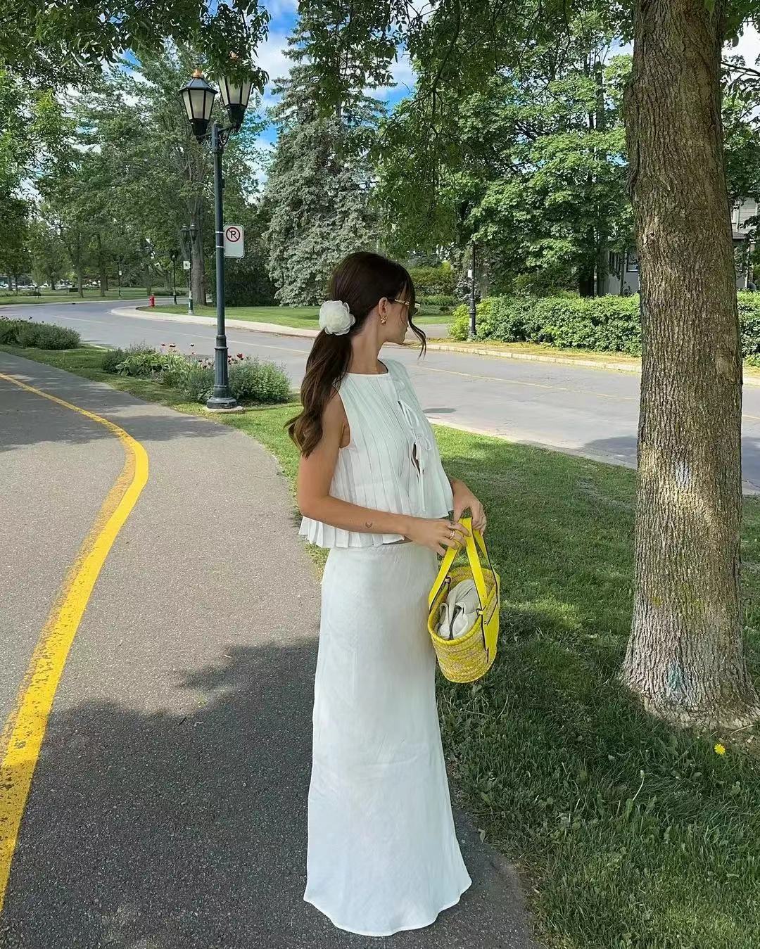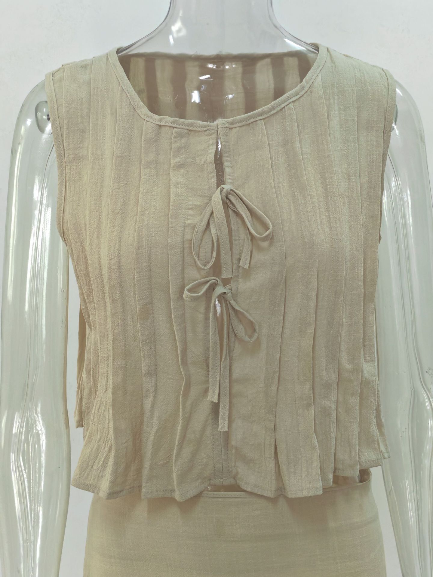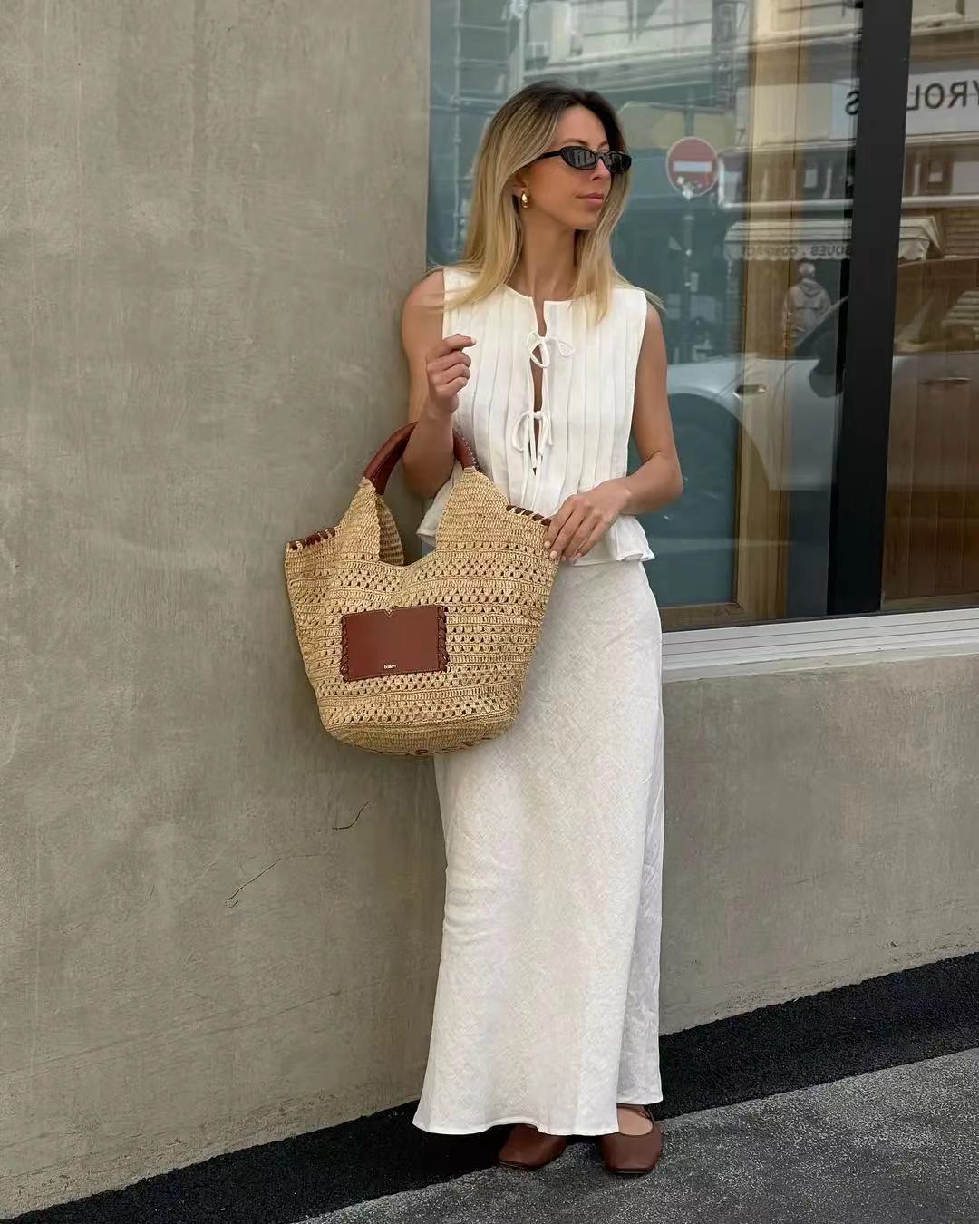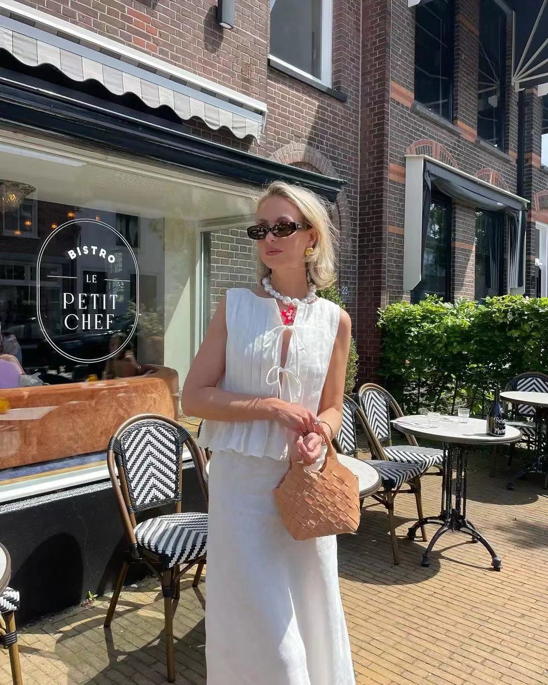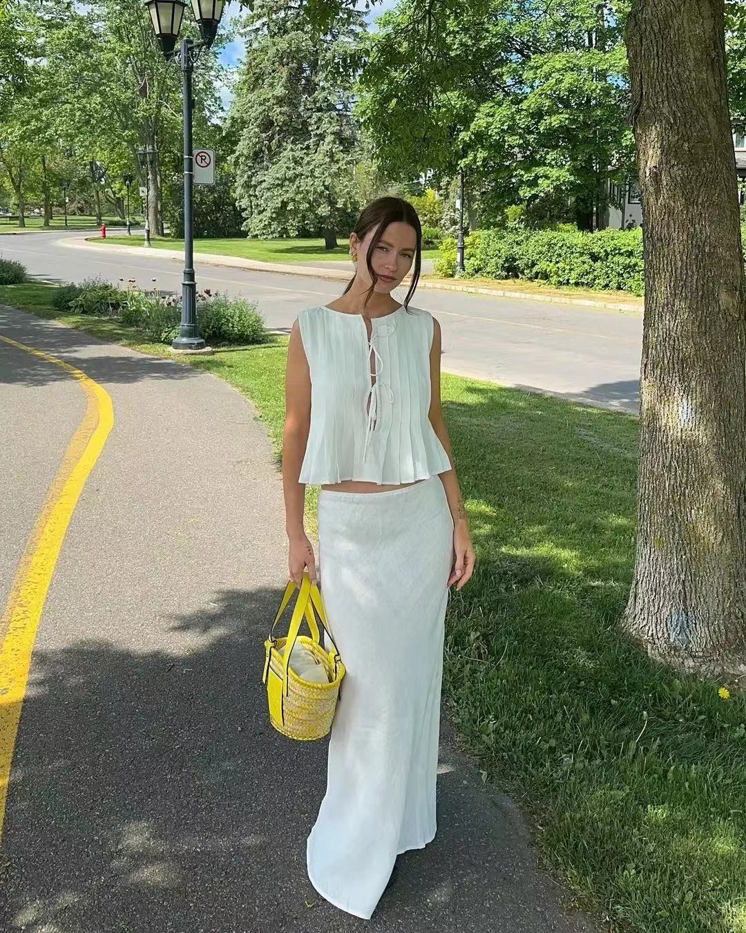 6가지 색상, 전 사이즈, 유럽 및 미국 국경 간 인기 통기성 면 및 린넨 주름 민소매 스트랩 여성용 셔츠, 하이 스트리트 롱 스커트스토어 가기