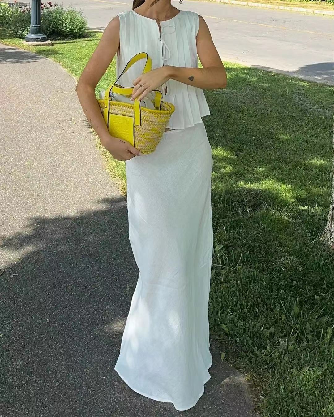 6가지 색상, 전 사이즈, 유럽 및 미국 국경 간 인기 통기성 면 및 린넨 주름 민소매 스트랩 여성용 셔츠, 하이 스트리트 롱 스커트