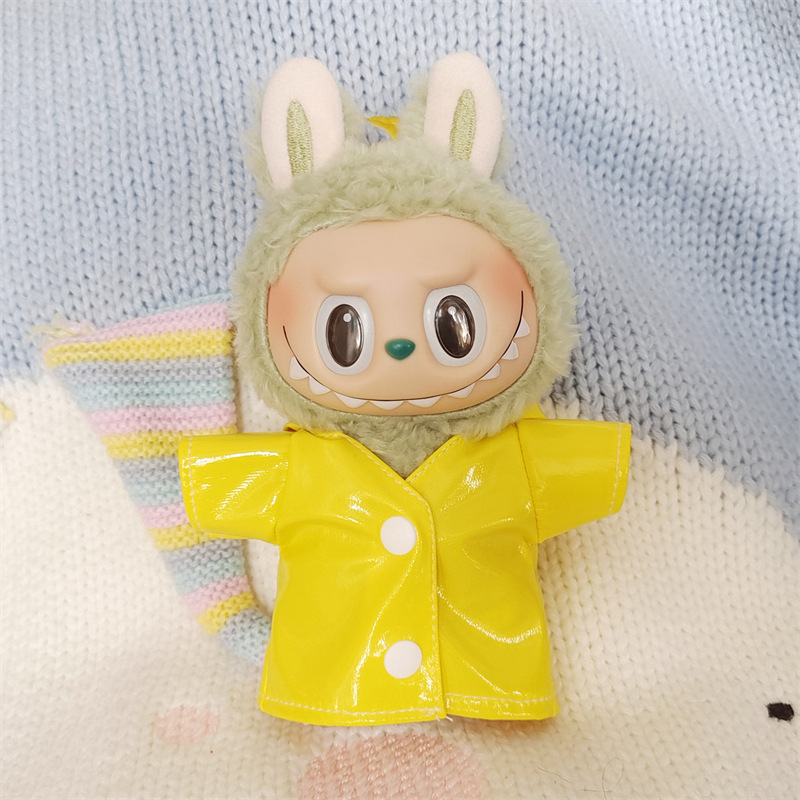뜨거운 판매 14cm 핸드독 노란색 비옷 가죽 코트 숨겨진 버튼 옷 옷 Labubu 액세서리 컬렉션 재고