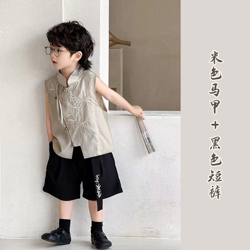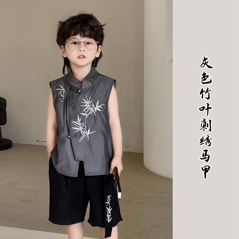 소년 세트 2024 여름 새로운 어린이 새로운 중국 대나무 잎 자수 민소매 조끼 반바지 아동복 헤어 세대스토어 가기