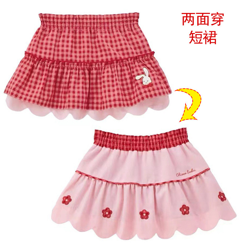 재고 미키 스커트 여름 새로운 소녀 만화 cs 토끼 꽃 자수 체크 무늬 스커트 양면