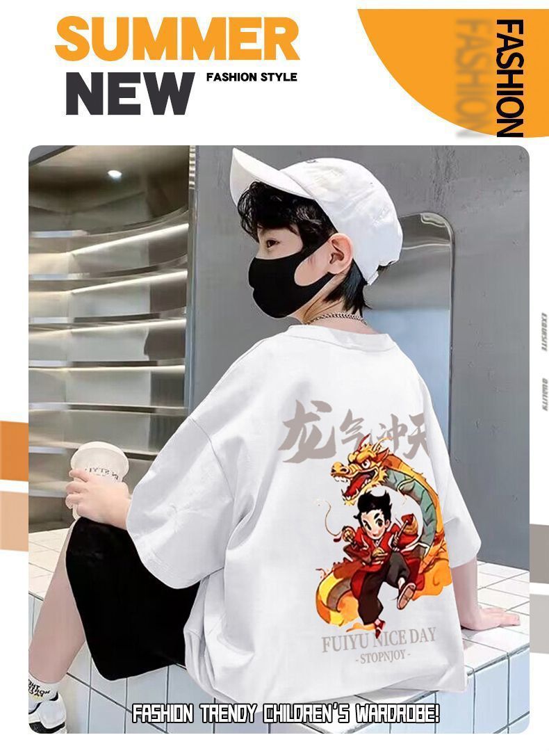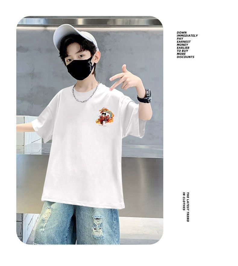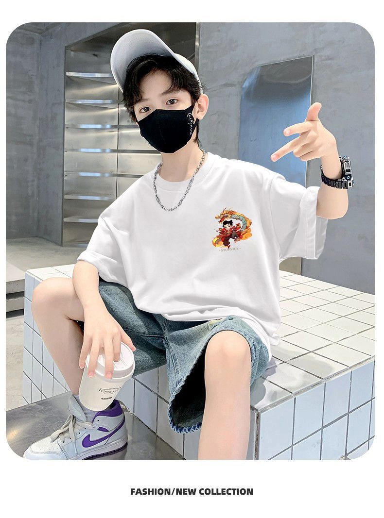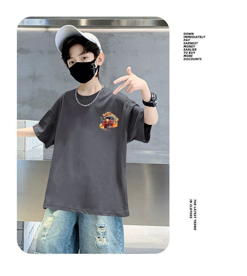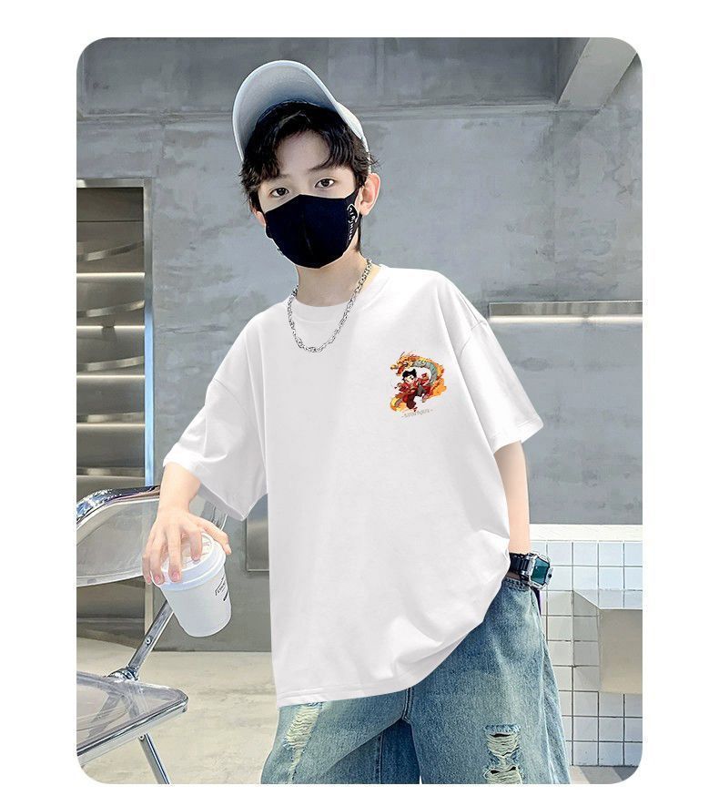 코튼 보이즈의 반팔 티셔츠 여름 새로운 유행 멋진 잘 생긴 느슨한 손짓 만화 중첩 어린이 반소매 어린이 유행