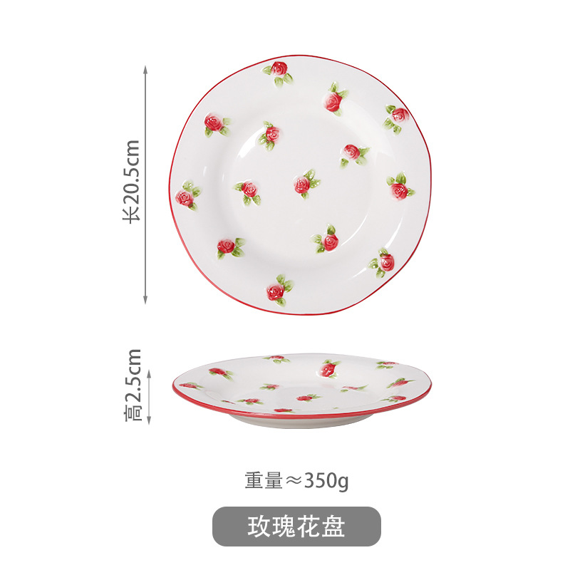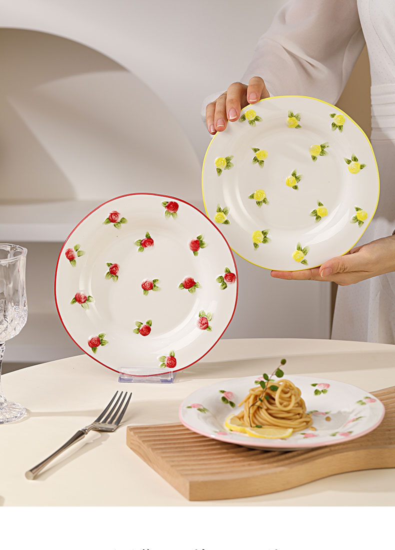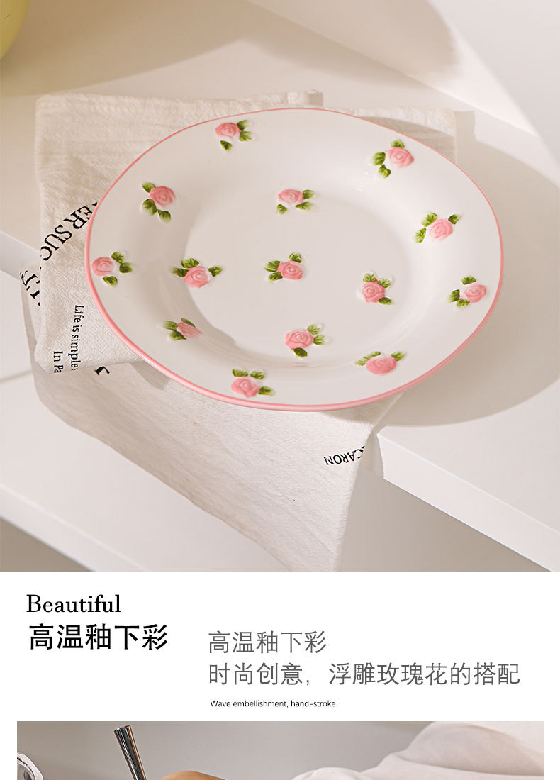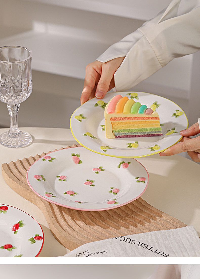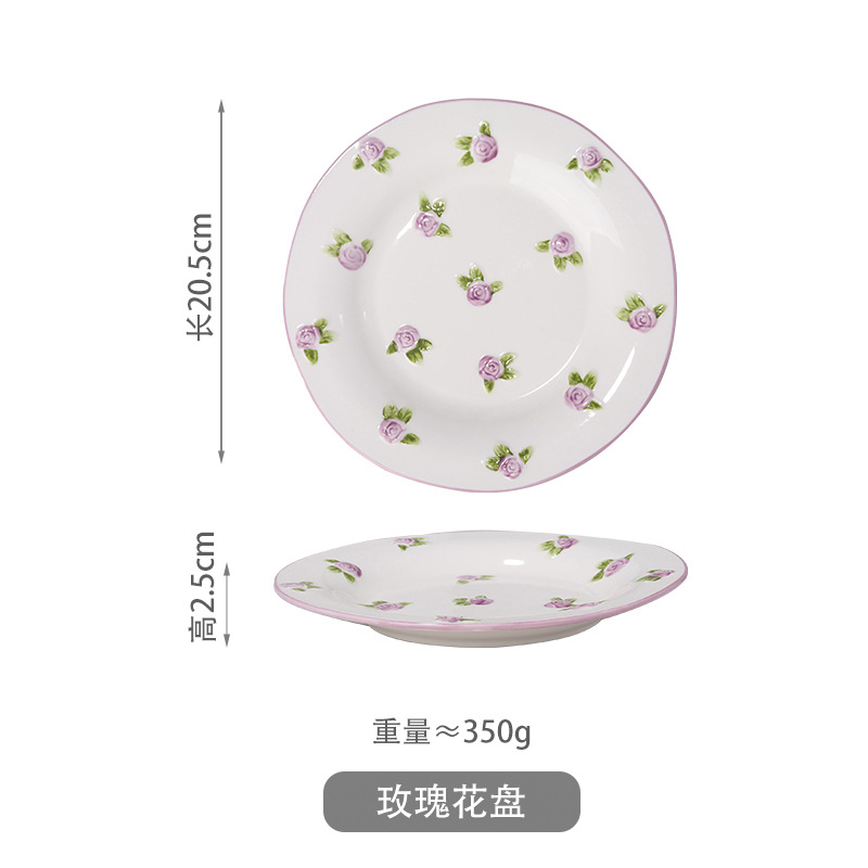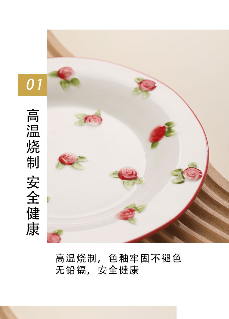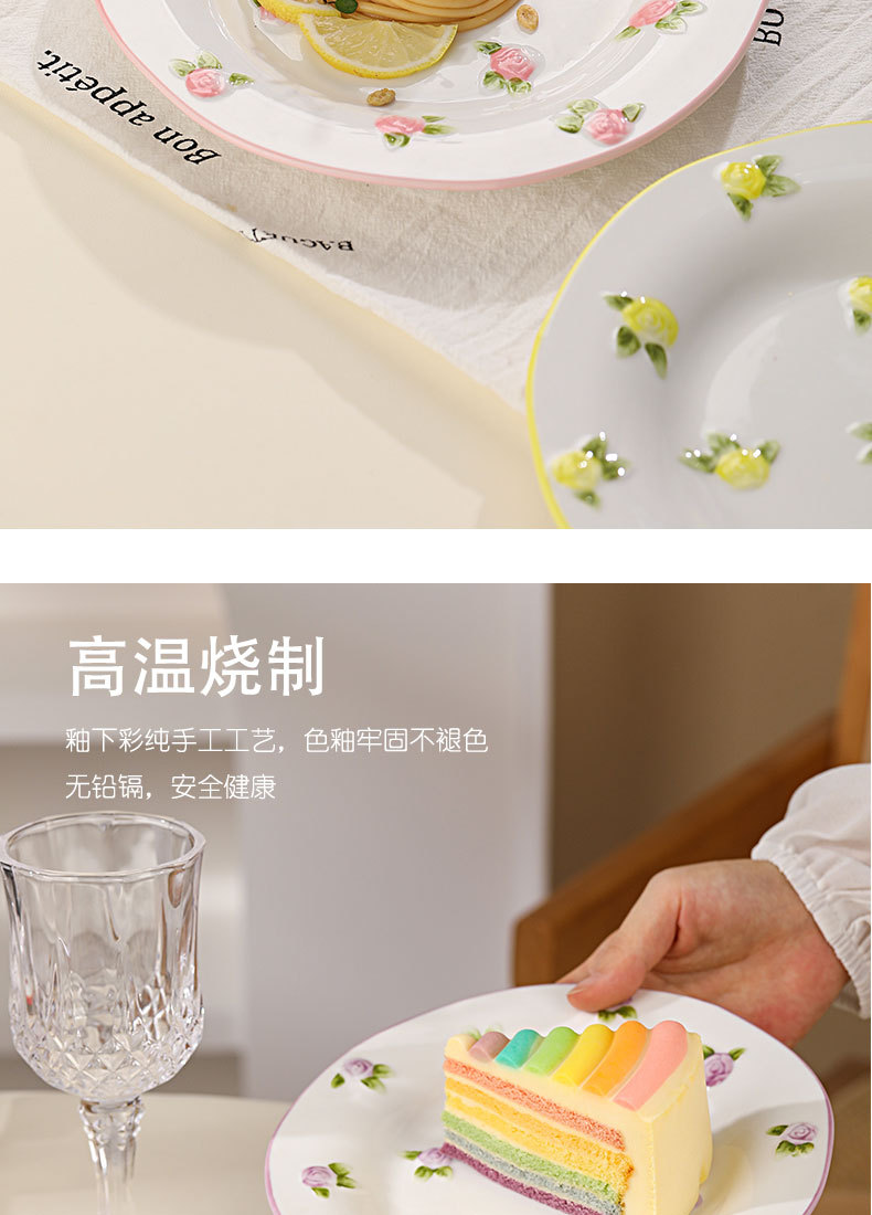 浮雕手绘陶瓷圆盘高颜值点心蛋糕盘耐高温无铅釉下彩迎宾水果盘子