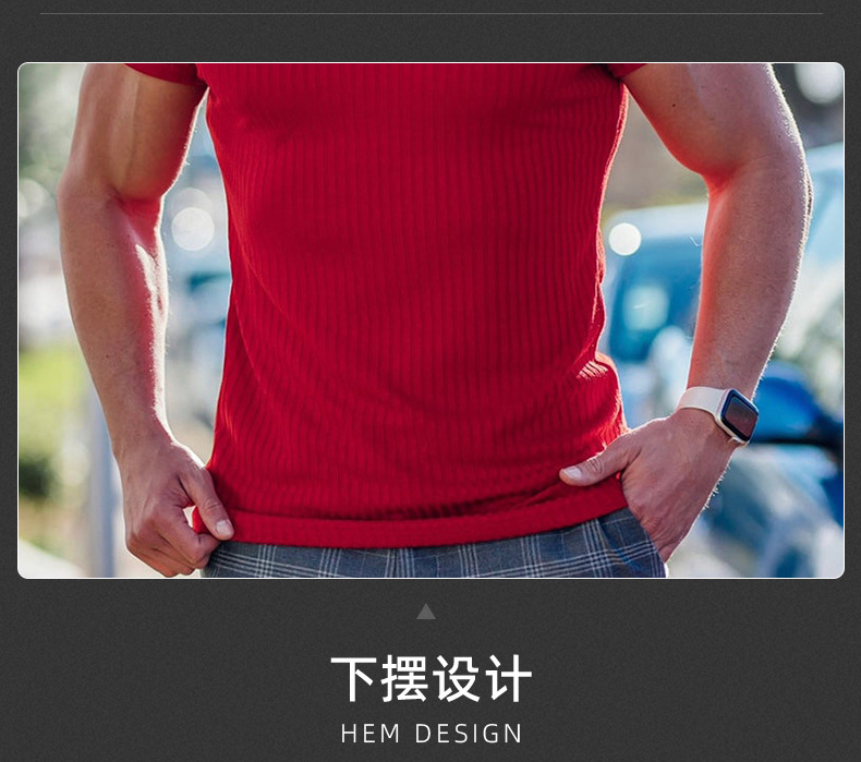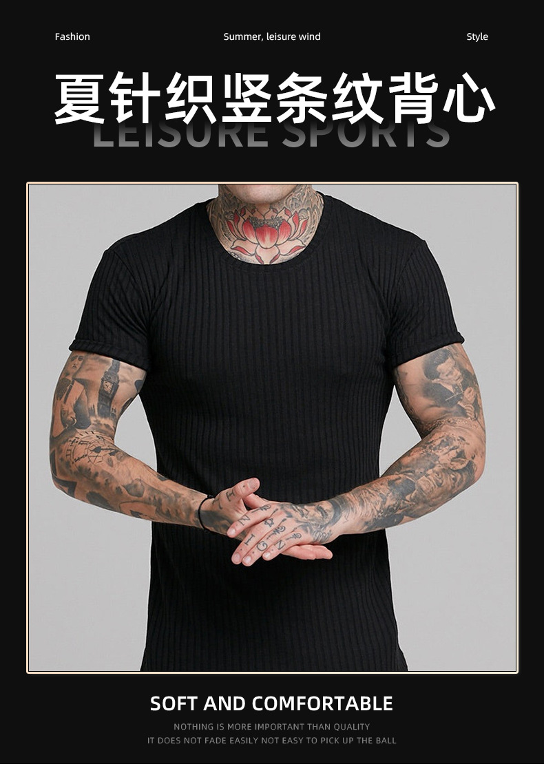 스팟 유럽과 미국 스포츠 및 피트니스 니트 세로 스트립 티셔츠 남성용 라운드 넥 탄성 반팔 여름 옷 짧은 티셔츠 남성용 슬림 피트스토어 가기
