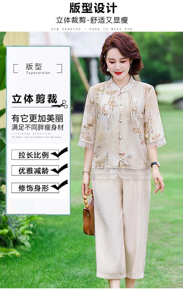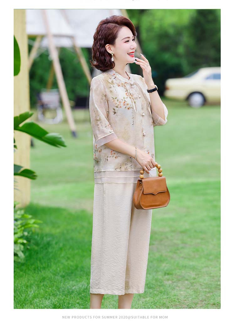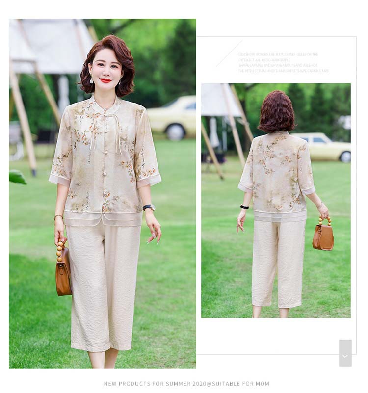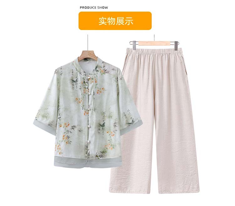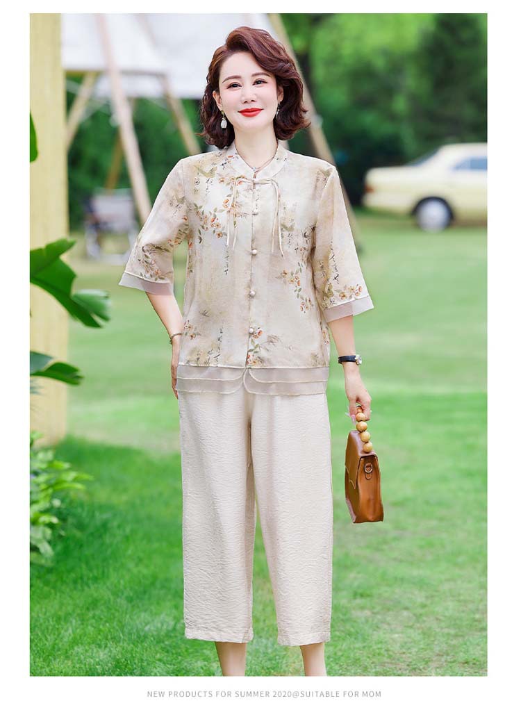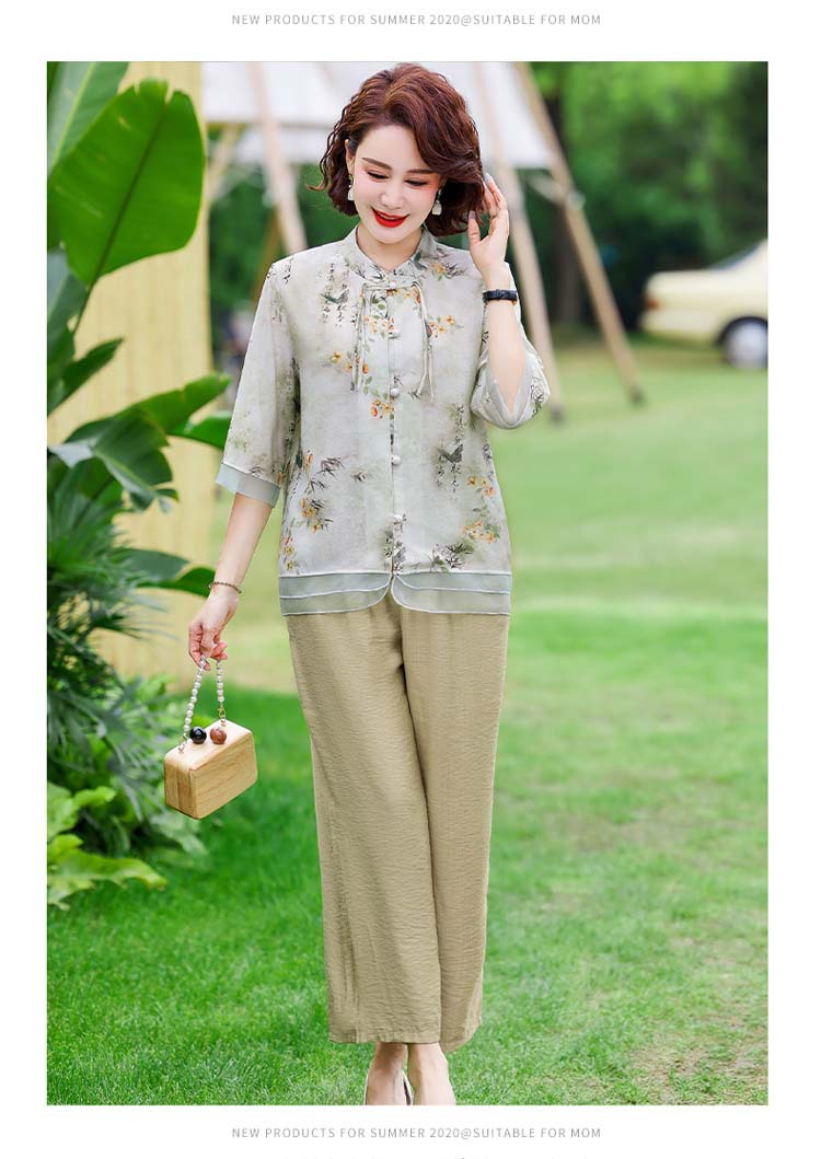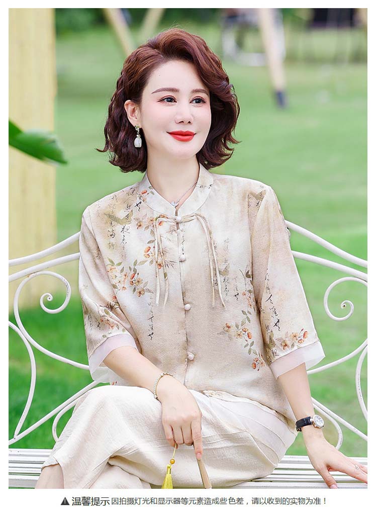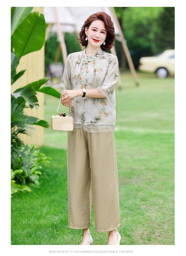 중년 및 노인 여성의 여름 중국 스타일의 국가 스타일 미드 슬리브 셔츠를위한 중년 어머니의 면화 린넨 탑 세트 서양식 투피스 세트스토어 가기